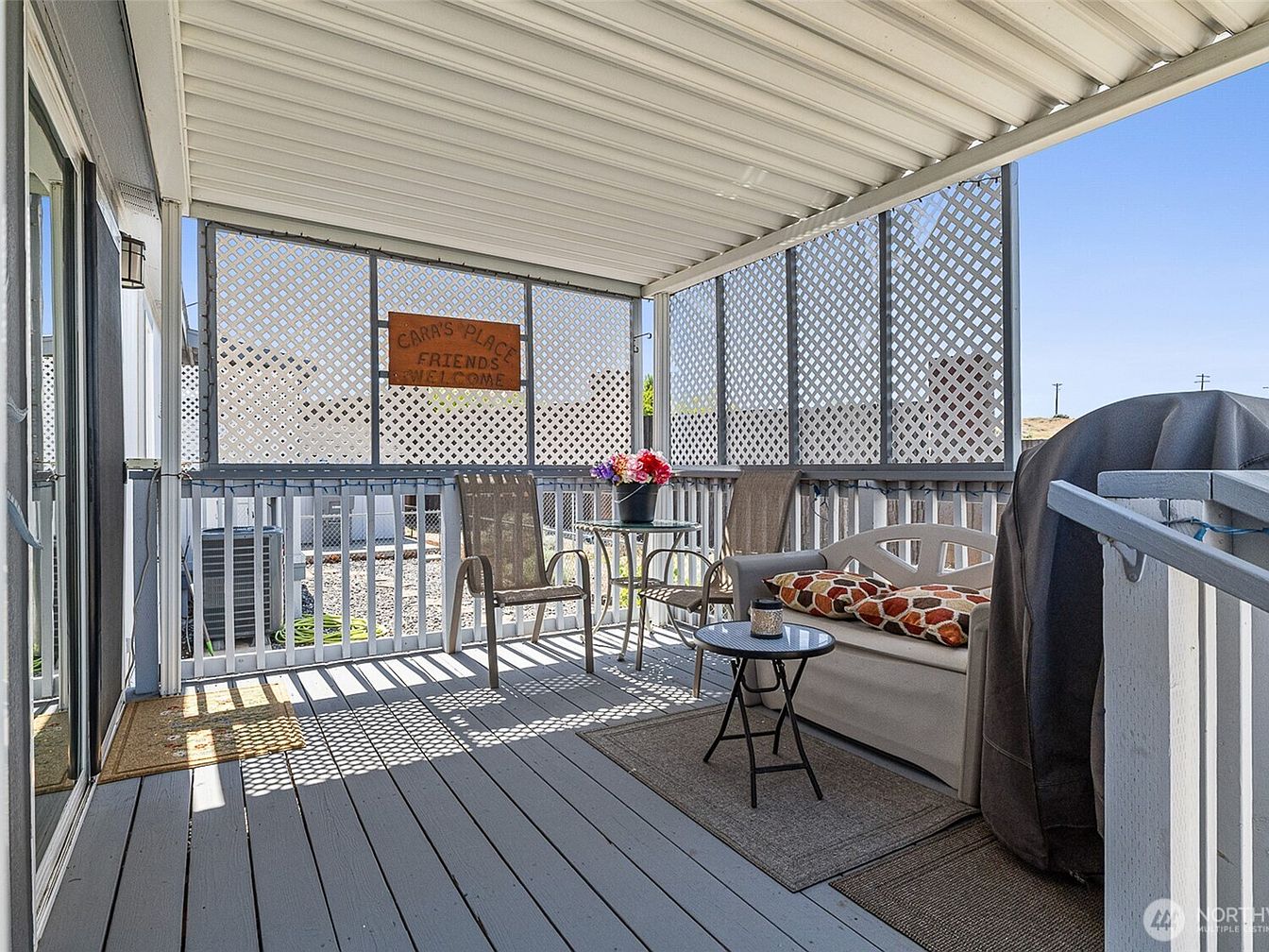This inviting covered porch features a white wooden lattice wall that envelopes the space, providing privacy while allowing natural light to filter through. The porch floor is painted a soft gray, complementing the light color palette. Furnishings include a beige outdoor loveseat adorned with patterned cushions in warm tones, two mesh chairs, and a small glass-topped round table with a colorful flower pot centerpiece. A compact black side table with a candle adds a cozy touch. The porch ceiling is simple with white paneling, making this a comfortable outdoor retreat for relaxation or socializing.