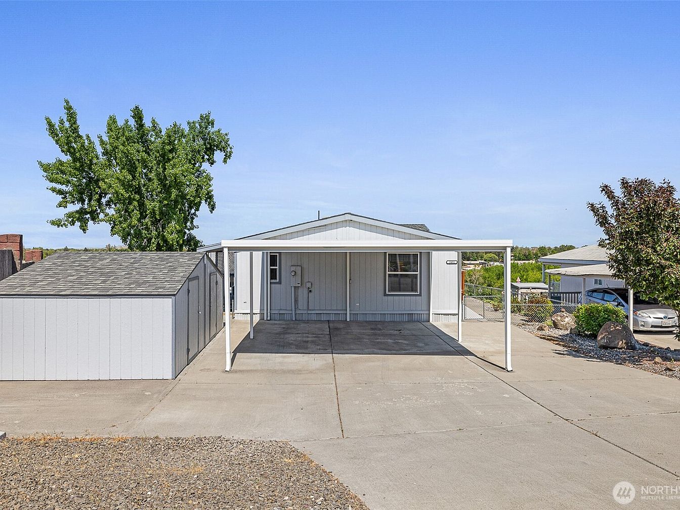 This exterior view features a simple, functional carport attached to the side of the house, offering sheltered parking space for two vehicles. The carport’s white metal framing complements the home’s light gray siding, creating a cohesive, clean look. Adjacent to the carport, a matching storage shed with a shingled roof provides practical outdoor storage options. The driveway and surrounding area are paved with smooth concrete, maximizing durability and ease of maintenance. Mature trees and minimal landscaping with rocks and shrubbery frame the space, enhancing the straightforward, low-maintenance aesthetic of this practical outdoor area.