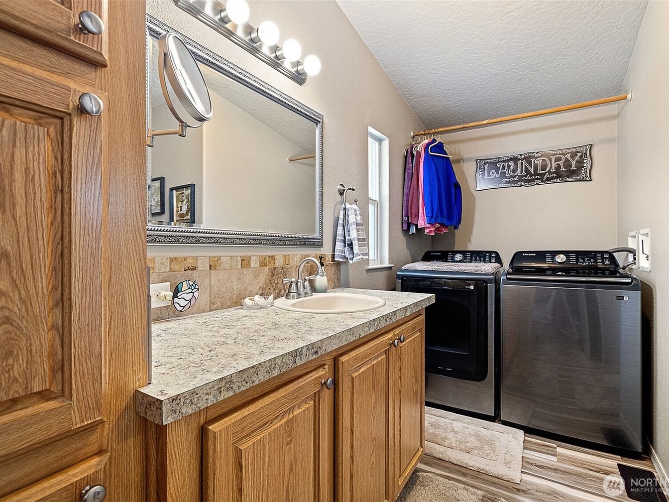 This functional laundry room combines practicality with warm, rustic charm. On one side, a granite-like countertop with a built-in sink offers space for hand washing or folding clothes, set over oak cabinets that add natural wood texture and ample storage. Above, a framed mirror with a decorative border reflects soft lighting from a three-bulb fixture, creating a bright work area. The modern washer and dryer, finished in sleek black stainless steel, sit beneath a wooden hanging rod for drying clothes. Neutral beige walls complement the multi-toned wood laminate flooring, while a small window brings in natural light, enhancing the inviting and organized atmosphere.