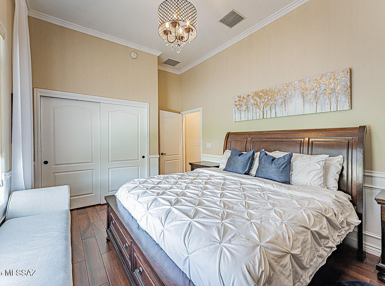This master bedroom exudes a serene and refined atmosphere, highlighted by soft beige walls complemented by white crown molding and chair rail accents. The dark wood sleigh bed, dressed in a luxurious white comforter with textured pin-tuck detailing, is paired with deep blue accent pillows for a pop of color. Matching dark wood nightstands flank the bed, adding symmetry. Flooring is rich, medium-tone hardwood, enhancing warmth. A crystal chandelier with a lattice drum shade adds an elegant focal point overhead. The room features a white cushioned bench below a window dressed with sheer curtains and a double sliding closet door, maintaining a clean and airy layout.