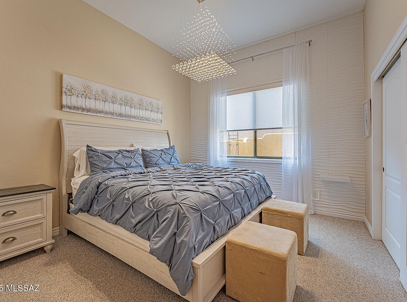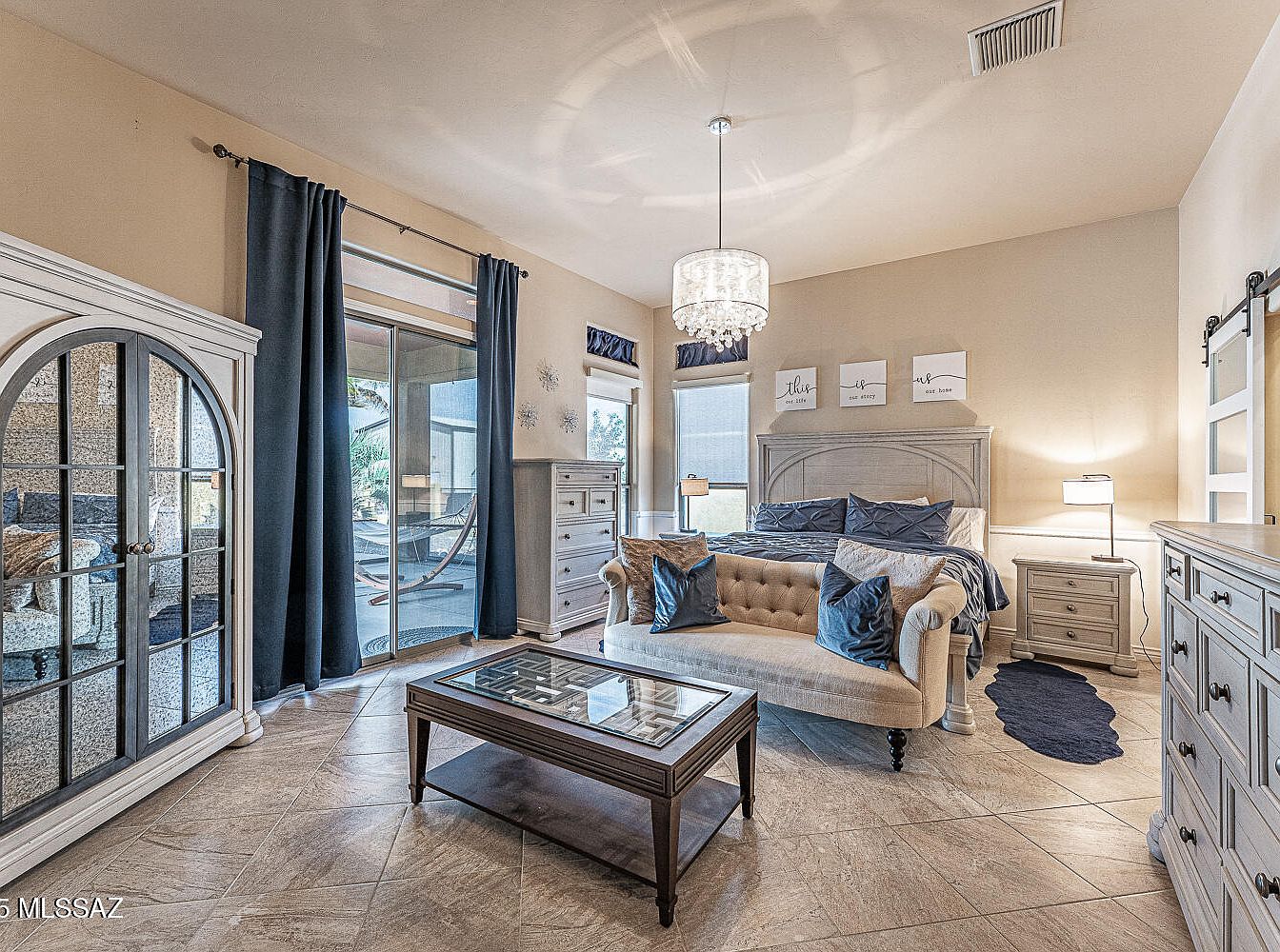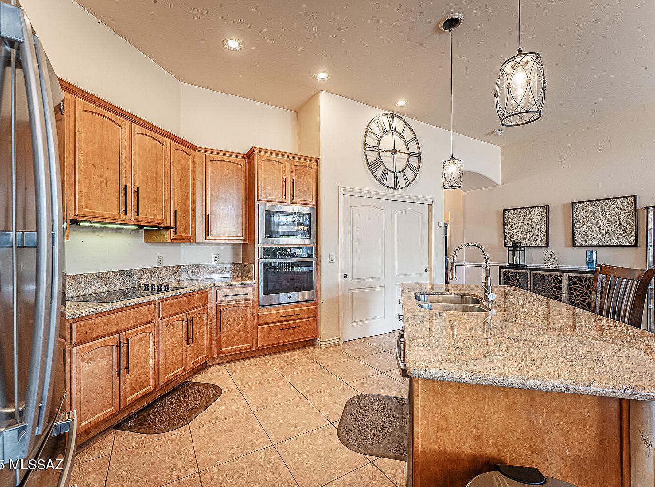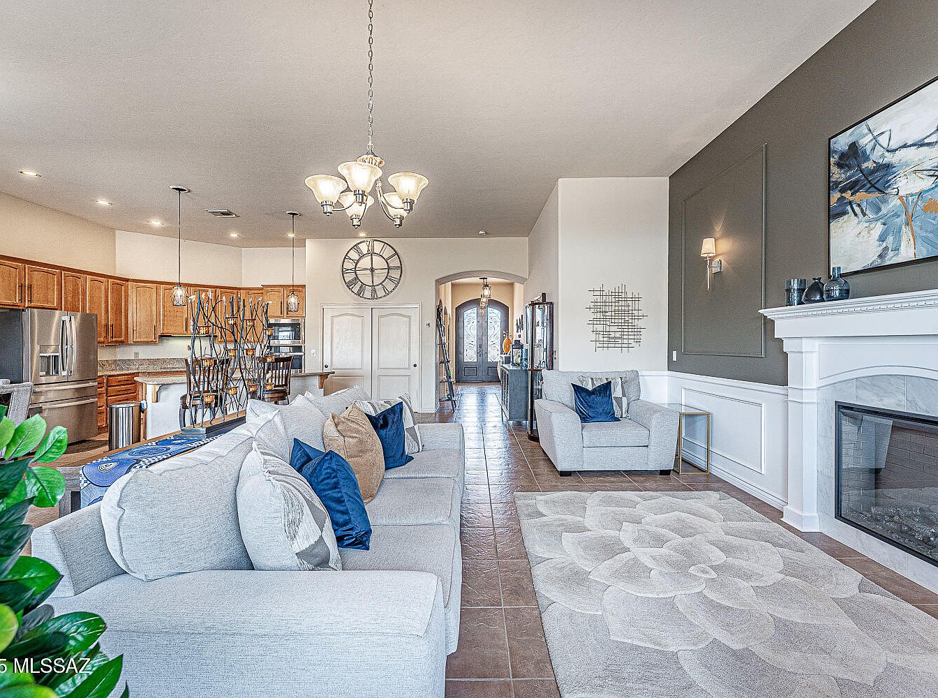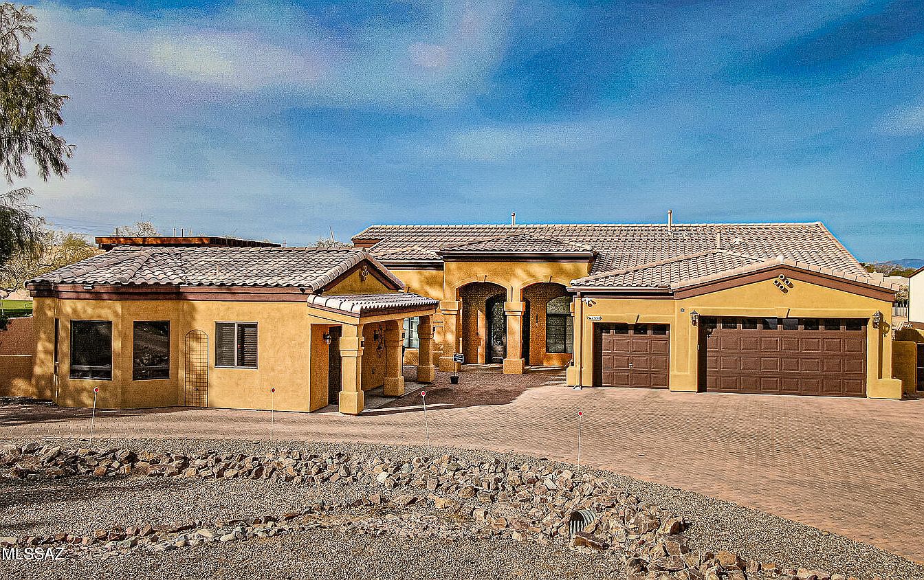 This stunning home in Sahuarita, AZ, located in the scenic Mesquite Heights neighborhood, exemplifies resort-style living without the constraints of an HOA. The residence, built with a spacious layout and a classic Southwestern architectural style featuring stucco walls and tiled roofing, rests on nearly an acre of land. Recently enhanced with high-end stainless steel GE Profile appliances installed in 2023 and a custom iron front door, the home offers a seamless and elegant flow throughout its interiors. The great room, illuminated by natural light, includes a cozy gas fireplace that integrates smoothly with the kitchen, appointed with granite countertops, ample cabinetry, and a breakfast bar and nook. A formal dining area complements the living spaces, perfect for hosting gatherings. The expansive Owner’s suite features direct backyard access and a luxurious en-suite bathroom with dual sinks and a large tiled walk-in shower. The smart split floor plan includes two additional bedrooms, a guest bathroom, and a flexible den ideal for a media room or office. The backyard is a private oasis with a shimmering pool, shallow lounging area, gazebo, and a porch with rolling screens, as well as extensive space for outdoor activities. The separate Casita offers a fully equipped kitchen, living room, bedroom, walk-in closet with laundry facilities, and a bathroom with a walk-in shower, opening to a private turfed yard. Additional amenities include a 3-car garage, RV parking, Wi-Fi enabled thermostats, a water softener system, contemporary lighting fixtures, a paved driveway, and an alarm system for peace of mind. Conveniently situated near shopping areas and with easy access to I-19, this home is listed at $835,000 and promises luxury and comfort in one exceptional package.