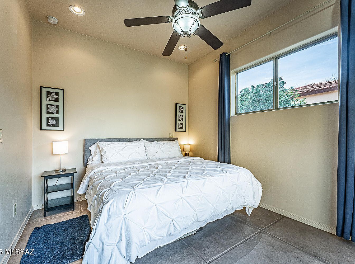 This bedroom features a clean and minimalistic design, highlighted by a large window that allows abundant natural light to fill the space. The walls are painted in a soft beige tone, complementing the light gray tiled floor. A white, textured comforter covers the bed, which is centered against the wall with a gray upholstered headboard. On either side of the bed, small black nightstands hold simple modern lamps, contributing to the room’s understated elegance. Dark blue curtains frame the window, adding a touch of color and contrast. A ceiling fan with lighting hangs overhead, aiding ventilation and illumination while maintaining subtle sophistication.