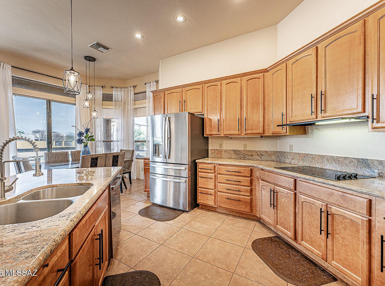This spacious kitchen features warm honey-toned wood cabinetry with sleek black hardware, complementing the earth-colored granite countertops and backsplash. A large island in the center incorporates a double sink with a modern, flexible faucet and offers ample counter space for meal prep. Soft beige ceramic tiles cover the floor, extending into the breakfast nook, which is bathed in natural light streaming through large windows adorned with sheer white curtains. Above the island, a trio of unique pendant lights add contemporary charm. Stainless steel appliances, including a French door refrigerator and built-in stovetop, enhance functionality while maintaining a cohesive, elegant aesthetic.
