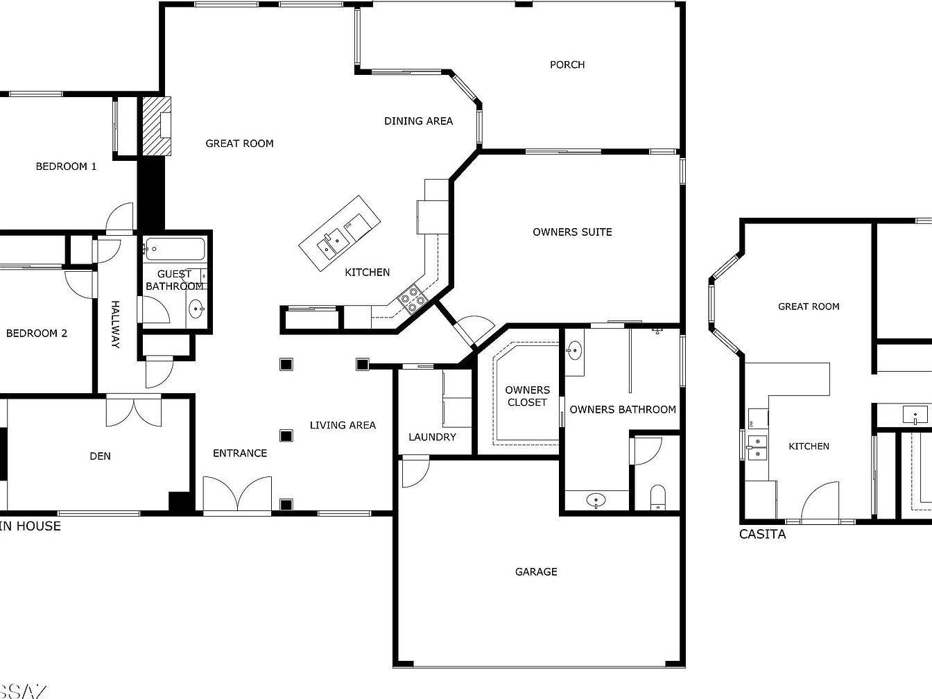 This well-organized floor plan features a spacious layout designed for comfortable living and entertainment. The main house includes a welcoming entrance area opening into a sizable living area adjoining the kitchen with an island, which flows seamlessly into the dining and great room spaces. Two bedrooms share a guest bathroom, while the owner’s suite offers privacy with an attached bathroom and walk-in closet. Additional rooms include a den and laundry area. The design incorporates an adjacent garage and a casita with its own kitchen, great room, and bathroom, ideal for guests or multi-generational living. A porch extends from the owner’s suite for outdoor enjoyment, all arranged for practical access and flow.