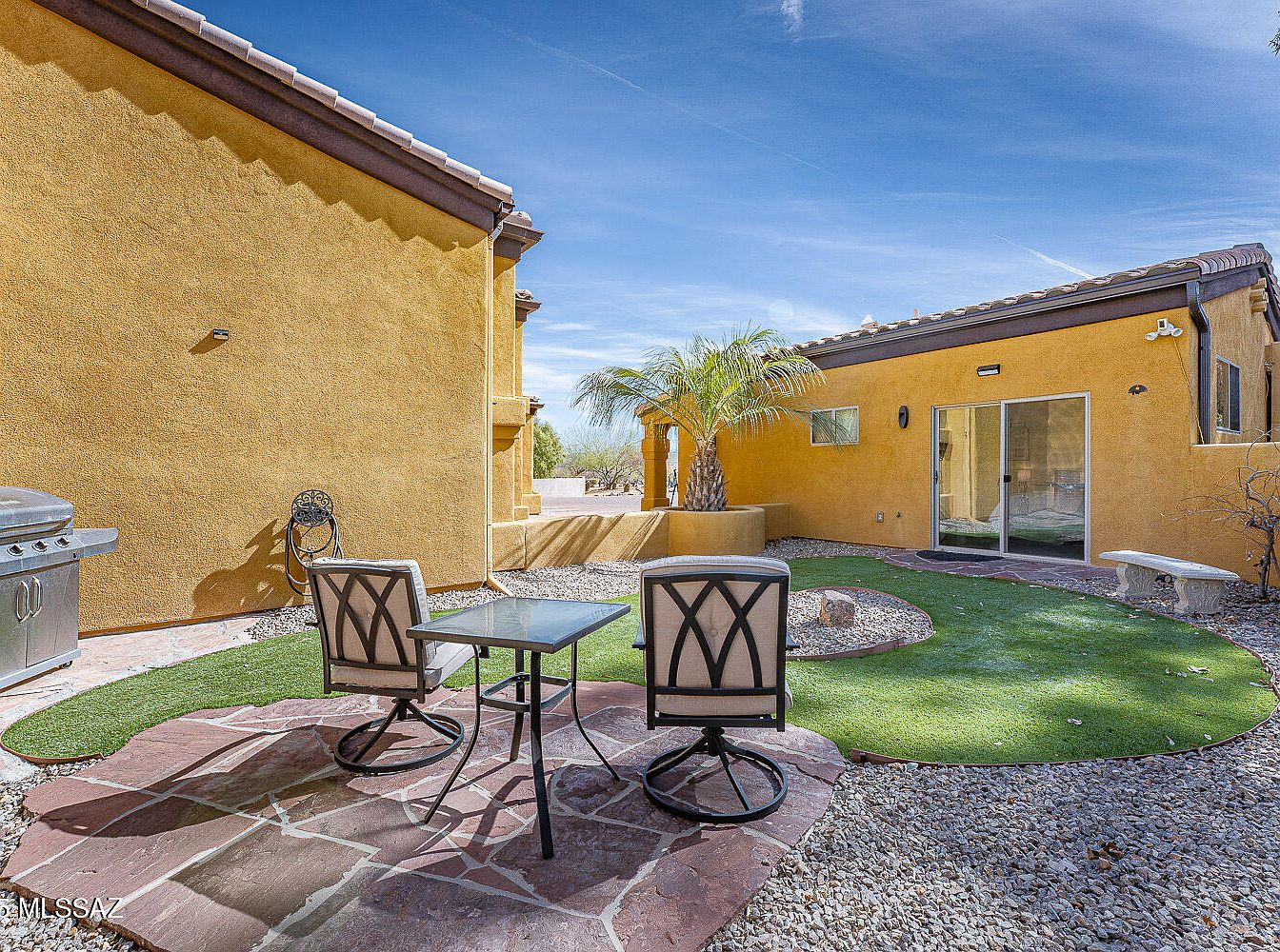 This cozy backyard patio showcases a warm, southwestern aesthetic with stucco walls painted in a rich mustard yellow, complemented by brown trim and a tiled roof. The outdoor space is designed for relaxation and entertaining, featuring a small stone-paved seating area with two cushioned swivel chairs and a simple metal table. Adjacent to this is a well-maintained artificial turf area bordered by light-colored gravel, accented by a single palm tree at its center, enhancing the desert vibe. Sliding glass doors provide easy access to the interior, while a stainless steel barbecue grill hints at social dining gatherings in this intimate outdoor retreat.