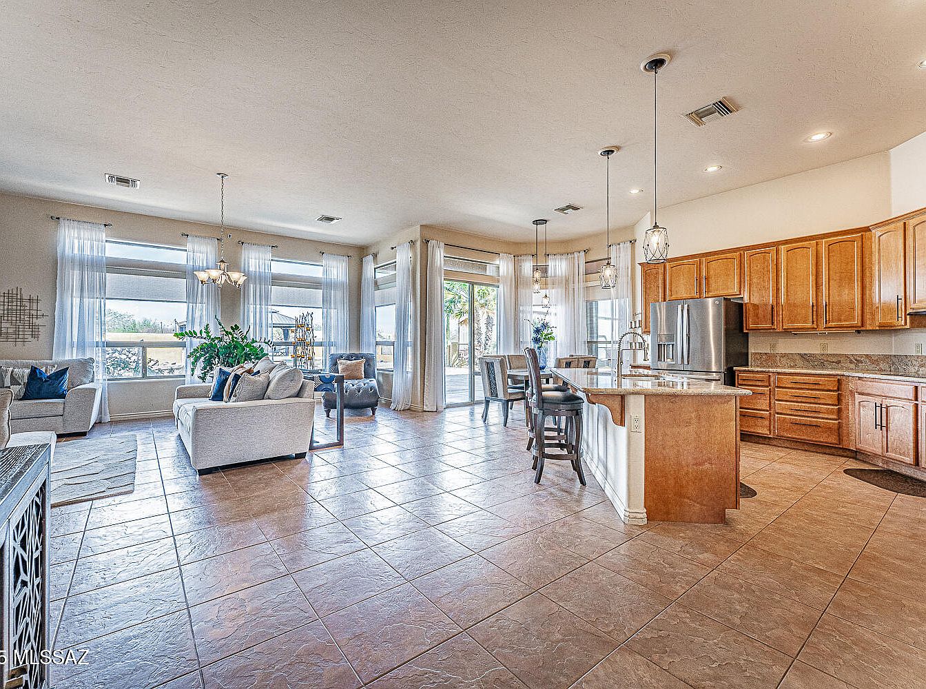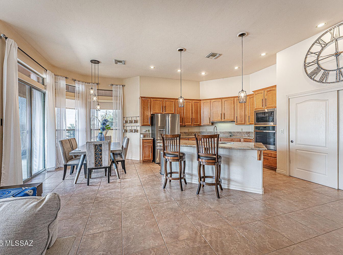 This spacious kitchen and dining area blend functionality with warmth through its open-concept design. The kitchen features honey-toned wooden cabinetry paired with granite countertops, creating a natural and inviting atmosphere. Stainless steel appliances, including a refrigerator and built-in ovens, add a sleek modern touch. A large island with a breakfast bar is accented by three pendant lights and two wooden bar stools, ideal for casual dining or entertaining. Adjacent to the kitchen, the dining space has a rectangular wooden table with cushioned chairs set beside large windows draped with sheer white curtains, allowing ample natural light that brightens the neutral-toned tile flooring and soft wall colors.