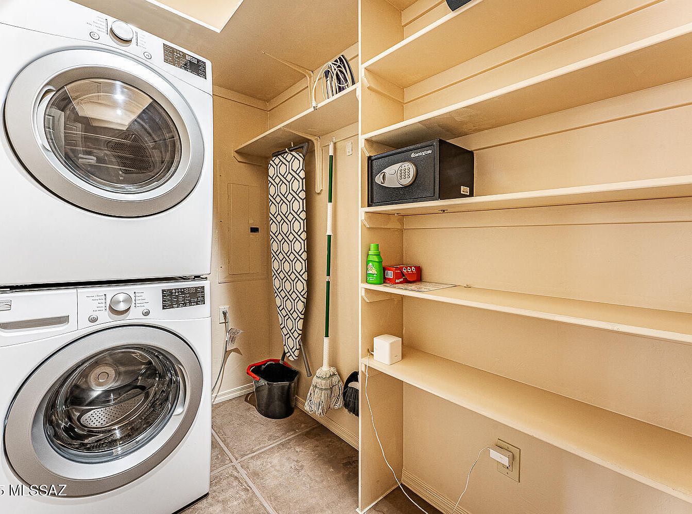 This compact and functional laundry room features a stacked washer and dryer with modern white finishes, maximizing vertical space. The room is painted in a warm beige tone that complements the large, square neutral-toned floor tiles. On one side, open shelving provides ample storage for cleaning products and miscellaneous items, including a small electronic safe for secure storage. Hanging on hooks next to the appliances is an ironing board, mop, and broom, showing practical use of wall space. The clean and organized environment emphasizes utility with a subtle warmth in design.