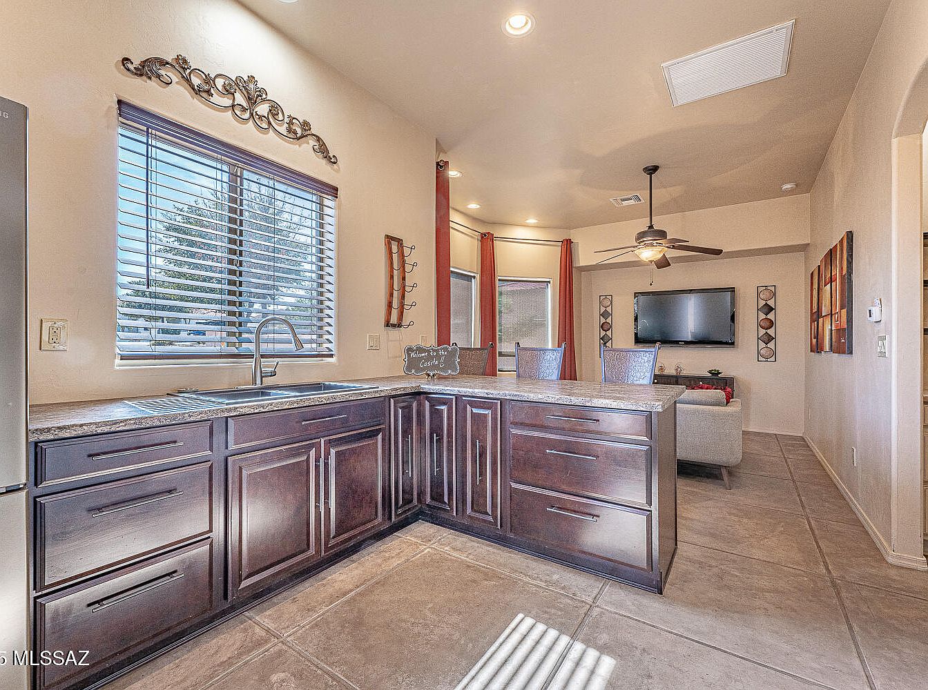 This kitchen features a practical L-shaped layout with dark wood cabinetry and sleek stainless steel handles. The granite countertop offers ample workspace while incorporating a dual sink positioned beneath a large window adorned with wooden blinds and a decorative iron scroll accent overhead. Flooring is a neutral-toned tile that runs continuously into the adjacent living area. Beyond the kitchen, three tall windows dressed with burnt orange curtains brighten the living space. The living room includes a mounted flat-screen TV, a ceiling fan with light, and modern artwork enhancing the beige walls, delivering a warm, inviting atmosphere that integrates seamlessly with the kitchen.