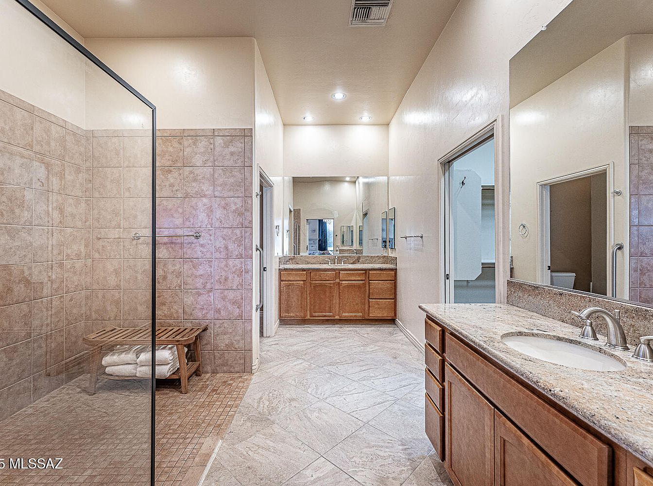 This spacious master bathroom features a large walk-in shower with beige tile walls and flooring, complemented by a wooden bench holding neatly folded white towels. The room showcases two separate vanity areas with granite countertops and undermount sinks, framed by wide mirrors that enhance the sense of space and reflect ample recessed ceiling lighting. Warm wood cabinetry under the countertops adds natural texture and storage options. The light neutral color palette, including soft beige and cream tones, creates a serene and inviting atmosphere, while the clean lines and practical layout emphasize comfort and functionality.