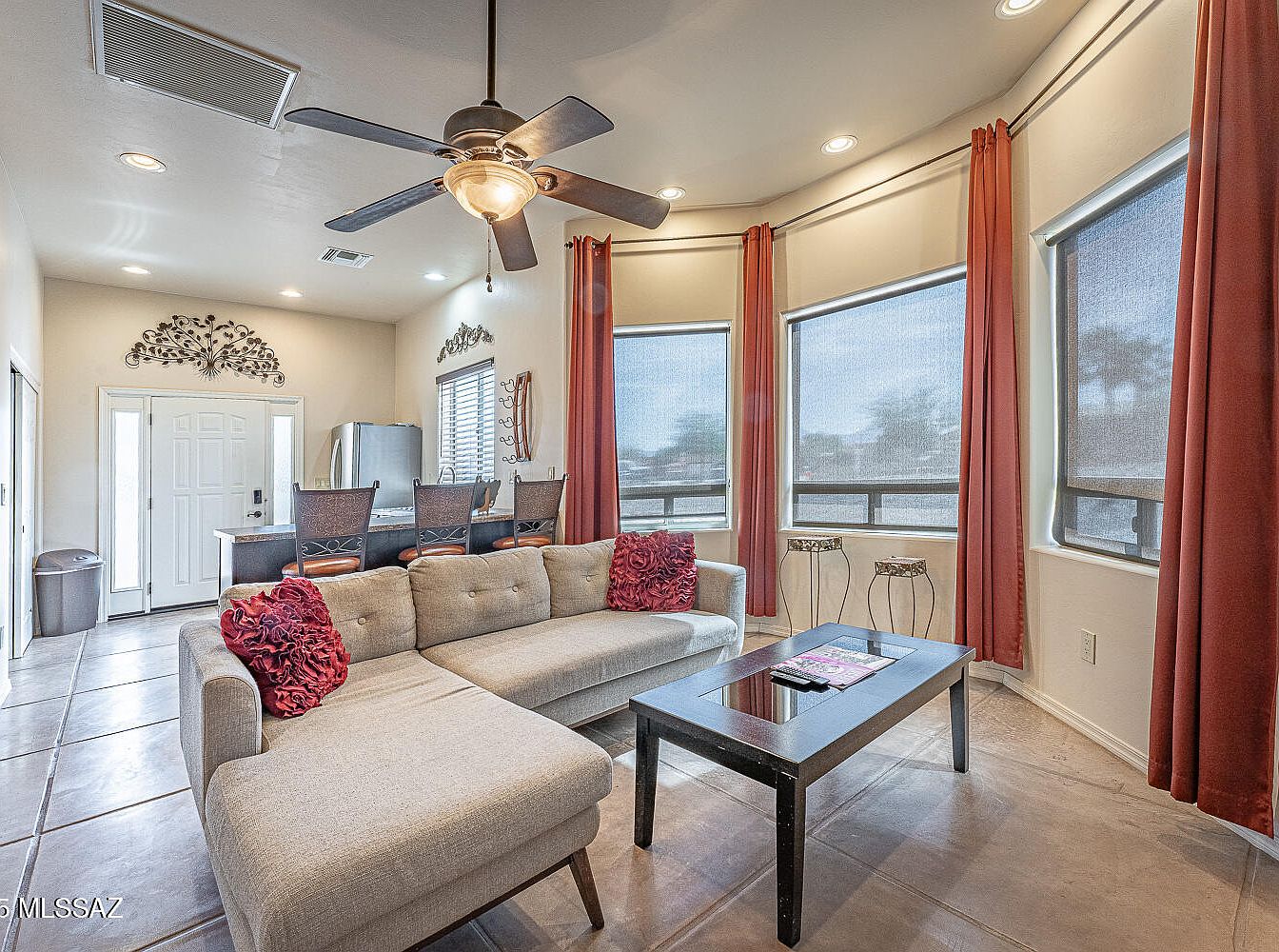 This inviting living room features a soft beige sectional sofa accented by deep red textured pillows, creating a warm focal point. Large corner windows are adorned with matching rich red curtains and light-filtering roller shades, allowing natural light to brighten the space while maintaining privacy. A simple black coffee table with a glass inset complements the minimalist aesthetic. The tiled floor extends seamlessly into the adjacent kitchen nook with bar seating. Decorative metal wall art adds a subtle touch of elegance above the front door, while a ceiling fan with a light fixture ensures comfort within this open, airy setting.