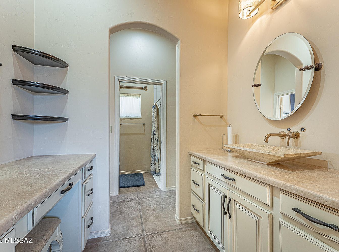 This bathroom features a warm, neutral color palette with beige walls and matching stone countertops. The vanity area boasts classic cream cabinetry with dark handles, complemented by a rectangular vessel sink and modern wall-mounted faucet in a brushed bronze finish. Above the sink, a large round mirror adds softness to the clean lines. To the left, curved black corner shelves provide storage and display options. The floor is covered in large square tiles in a grayish tone, leading to a small archway that opens into the shower space with a window and shower curtain. The overall style is a blend of traditional and contemporary elements, creating a welcoming and functional environment.