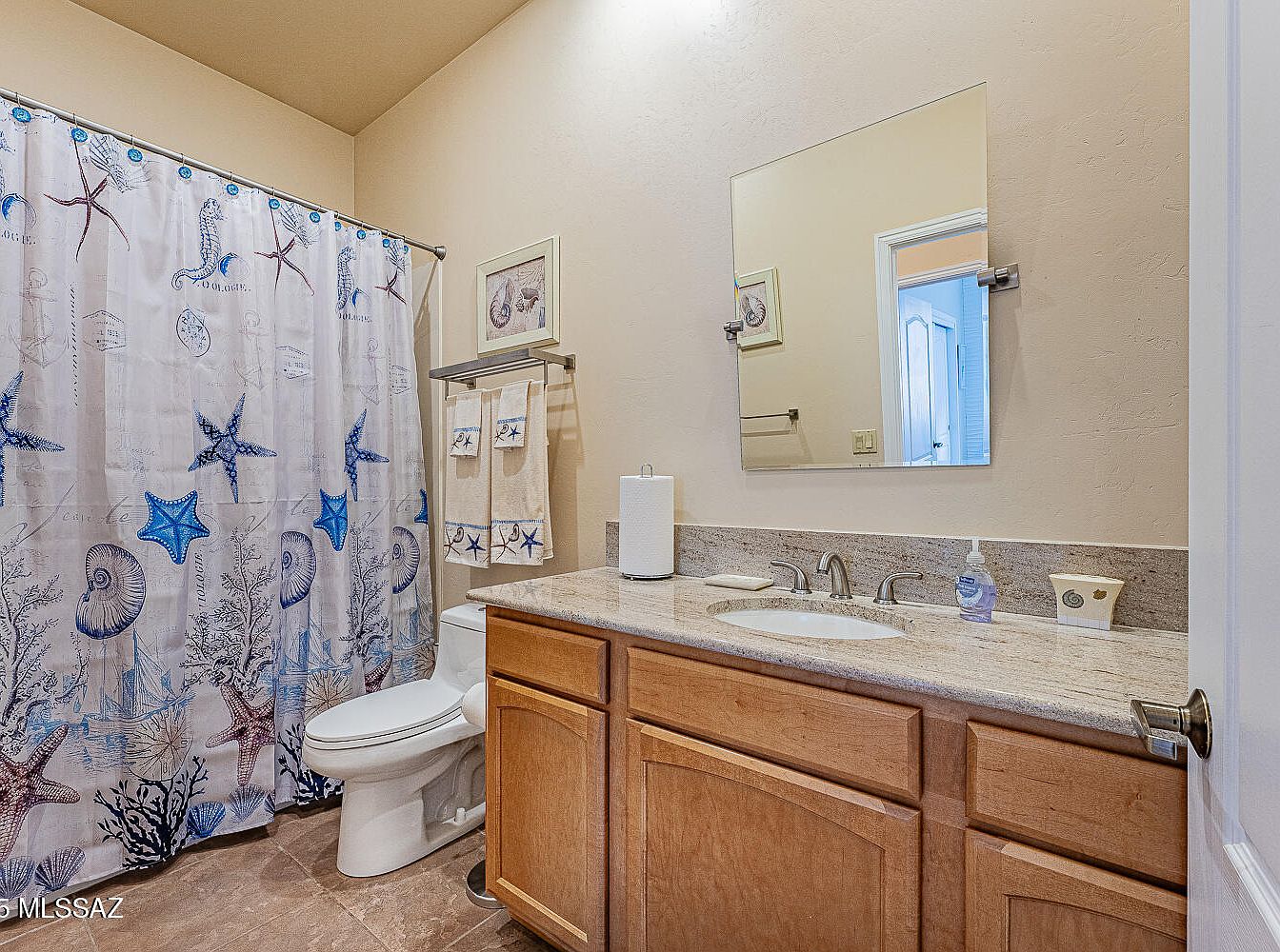 This bathroom features a practical layout with a light wood vanity topped by a granite countertop and an integrated sink. The large rectangular mirror above the sink enhances the sense of space. Neutral beige walls and a matching tile floor provide a warm, inviting background. The shower curtain and towels introduce a coastal vibe, adorned with starfish, seashells, and marine motifs in shades of blue and beige, adding a refreshing aquatic touch. A simple wall-mounted towel rack and minimal countertop accessories keep the design clean and functional.