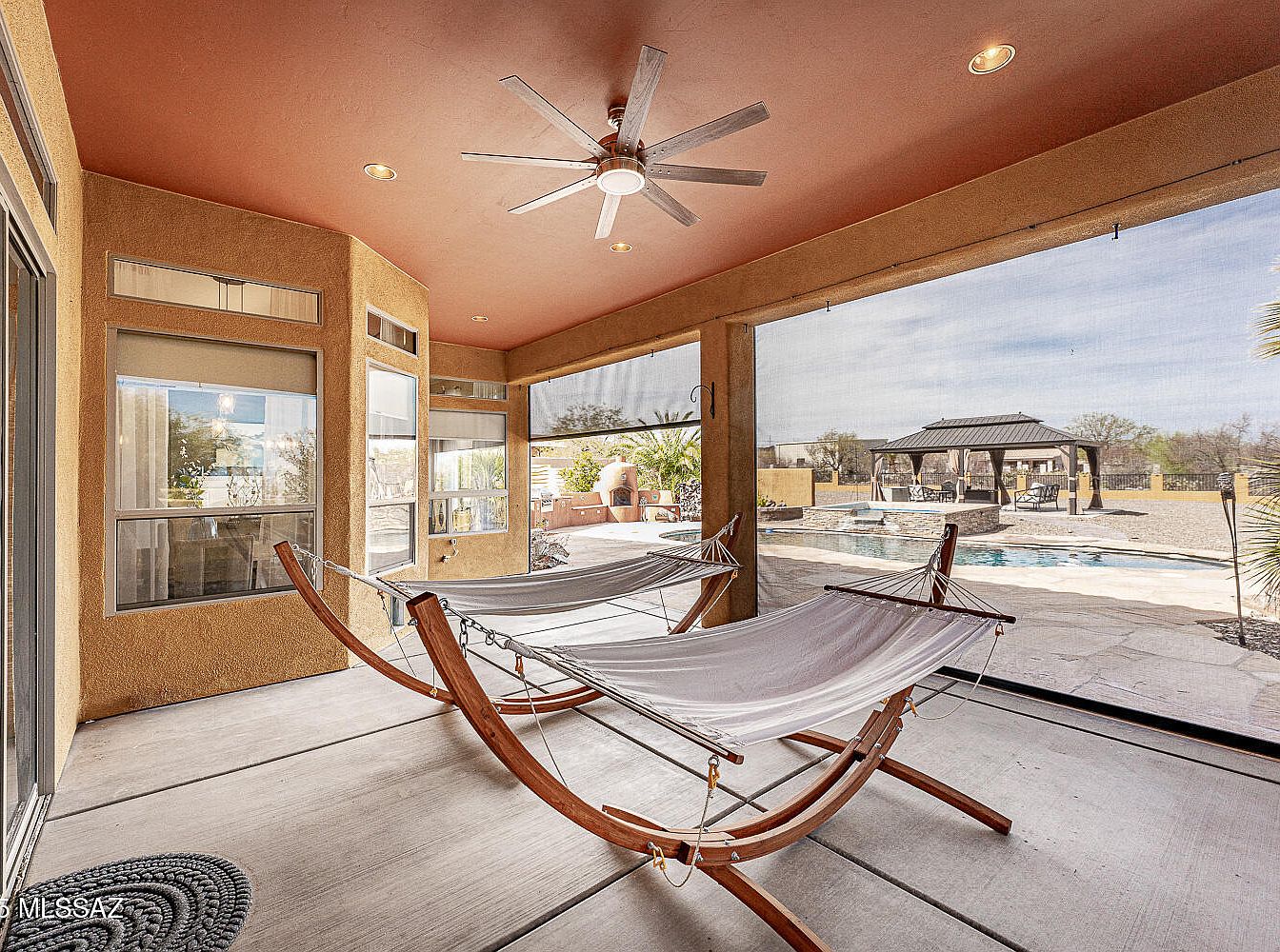 This cozy covered patio area features two modern wooden frame hammocks with white fabric slings, positioned for relaxation and outdoor enjoyment. The ceiling is painted a warm terracotta color that complements the textured stucco walls in a sandy beige tone. Recessed lighting and a large brushed-metal ceiling fan provide ambiance and ventilation. Large screened openings offer unobstructed views of a spacious backyard with a pool and a distant pergola-style sitting area. Concrete flooring adds a clean, durable surface ideal for outdoor settings. The space blends comfort and functionality, encouraging leisure amidst desert-inspired colors and open-air living.