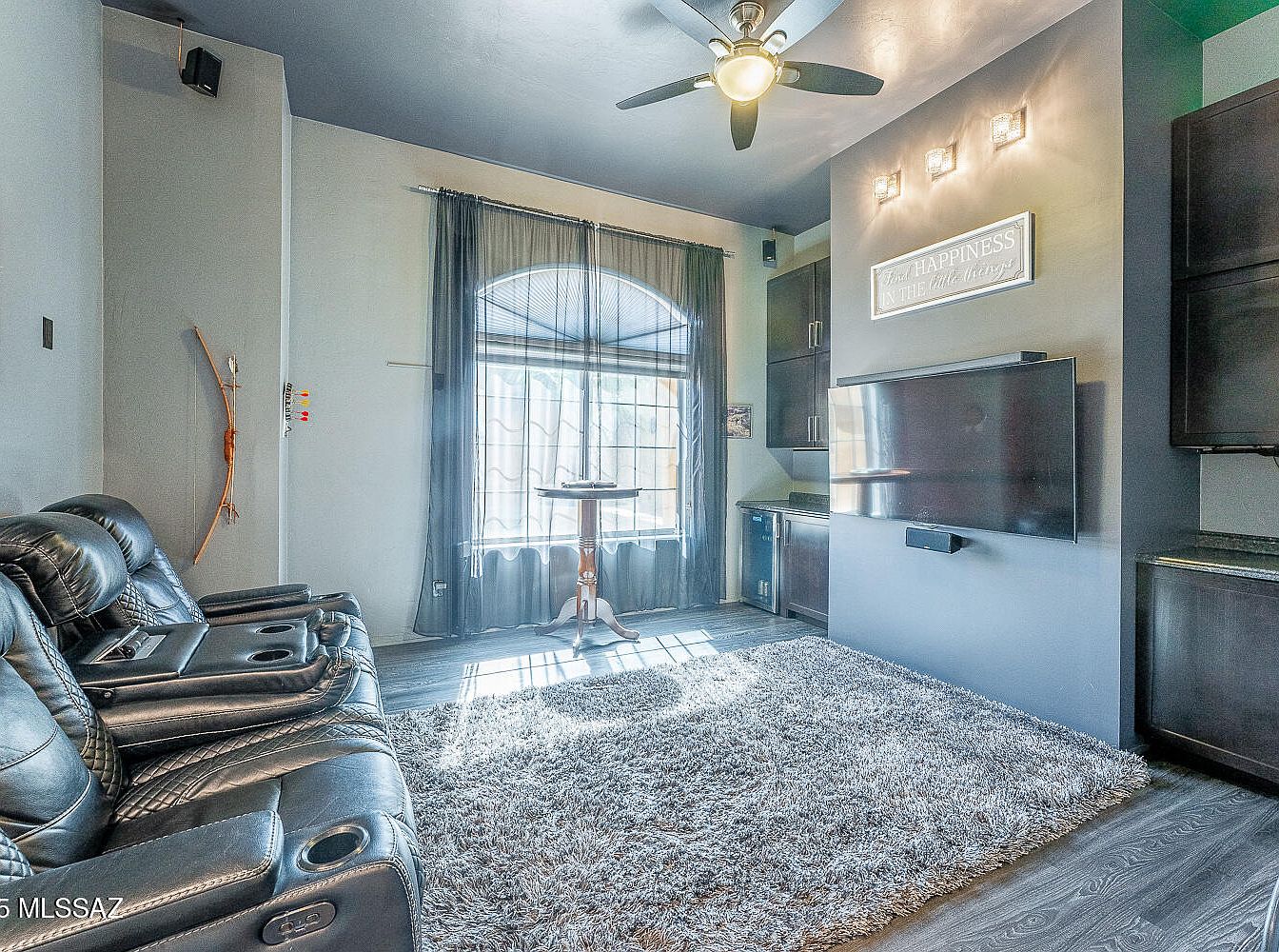 This media room features a comfortable, black leather reclining sofa facing a wall-mounted flat-screen TV, perfect for cozy movie nights. The ceiling is painted a calming blue and accented with a modern ceiling fan for ventilation. Natural light flows through a large arched window dressed in sheer, dark curtains that filter sunlight while maintaining privacy. Beneath, a plush gray shag rug covers the wood-look flooring, adding texture and warmth. Built-in cabinetry with dark finishes flanks the TV wall, providing storage and a mini fridge, blending functionality with sleek design in a compact, inviting space.