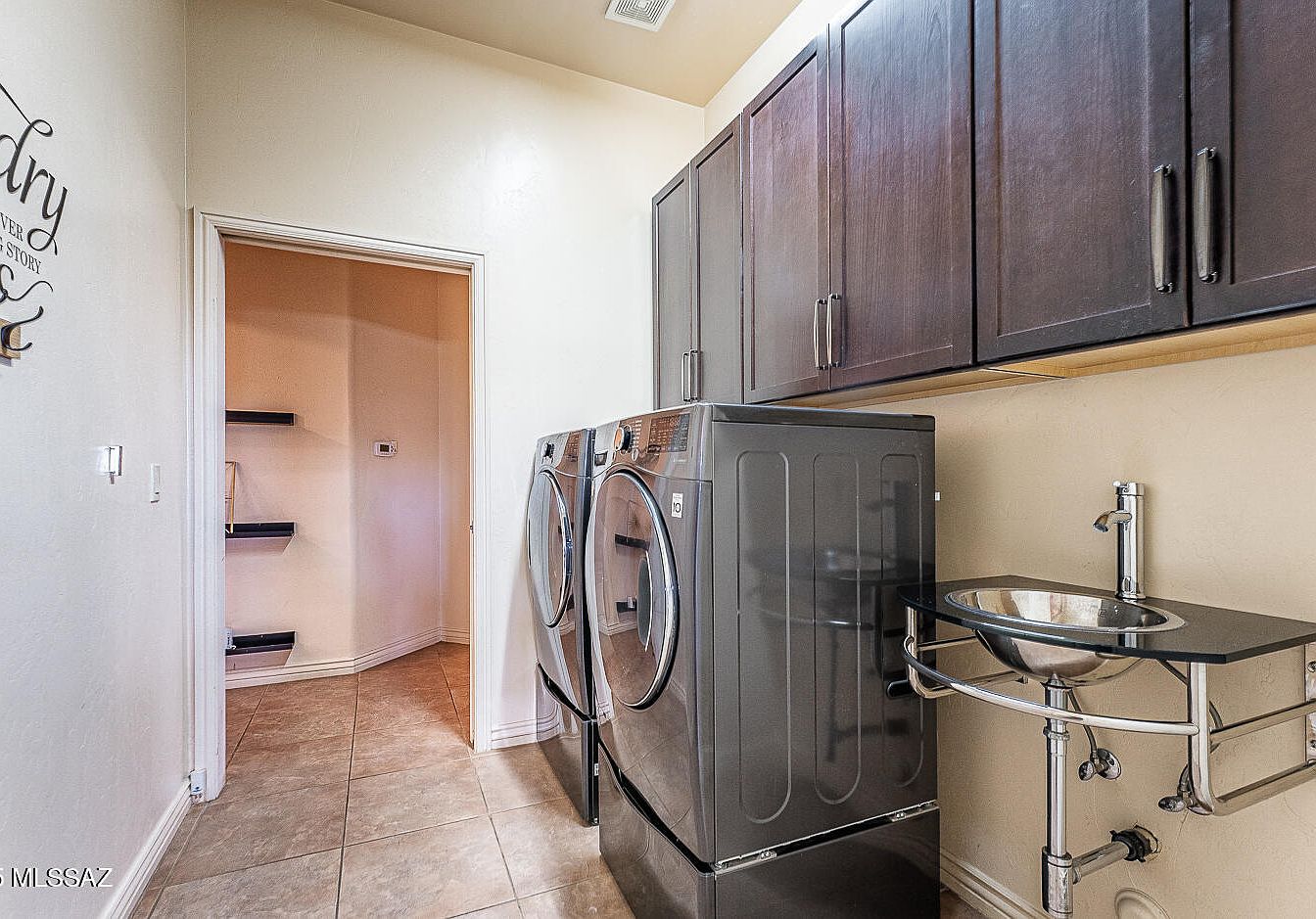 This laundry room features a clean and practical layout with a tiled floor that enhances durability and easy maintenance. The space is painted in a soft, neutral beige tone, lending warmth and subtlety. Dark wooden cabinets with simple, sleek handles provide ample storage above the washer and dryer, which are modern, matching front-loading machines with a metallic finish. A small, contemporary sink with a polished stainless steel basin and faucet is mounted on a minimalist black countertop, supported by a chrome frame to complement the appliances. The open doorway leads to an adjacent room, suggesting a well-connected utility area.