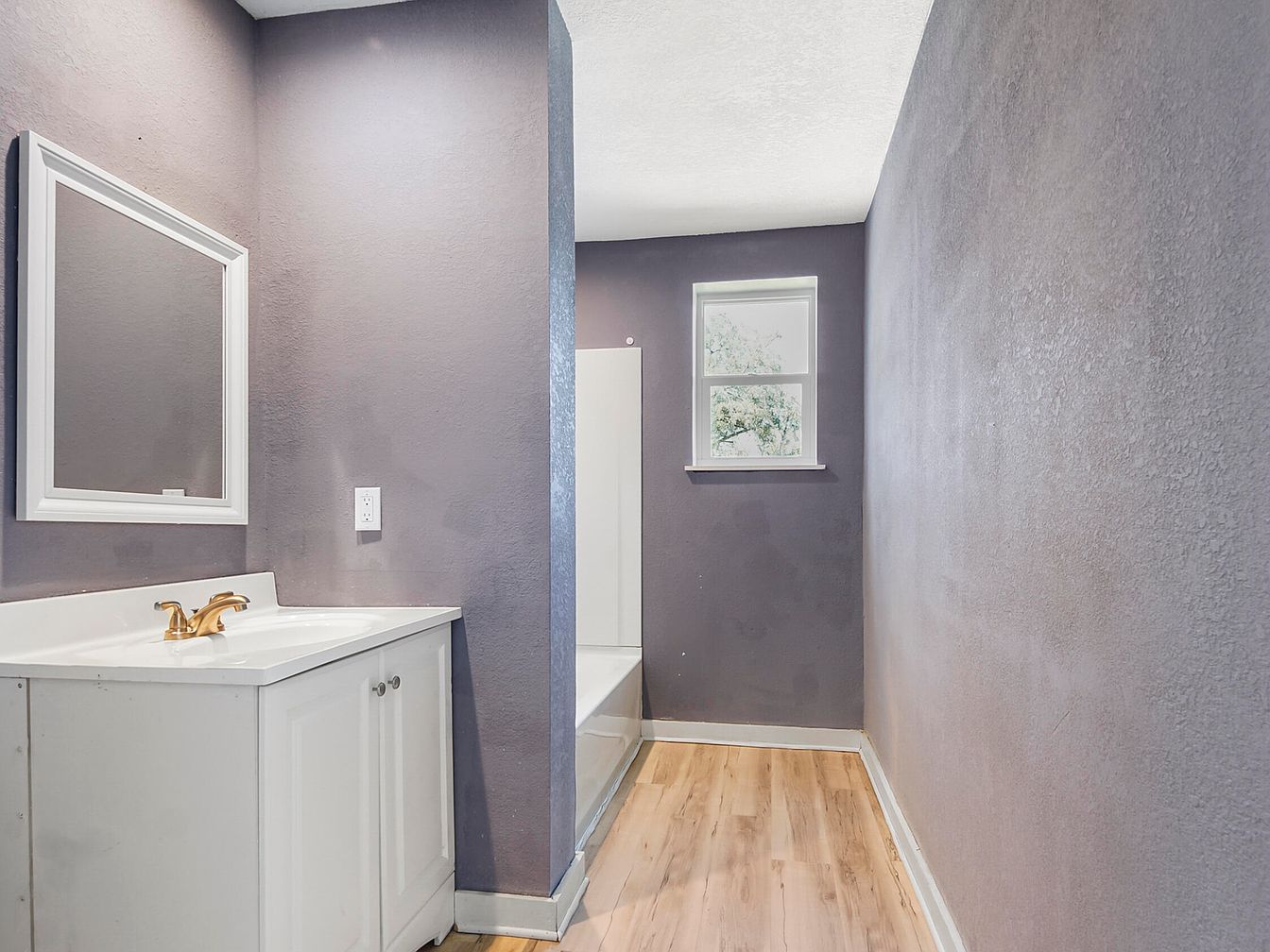This narrow bathroom features a muted lavender wall color that contrasts softly with the warm light wood-look flooring. The white vanity, topped with a clean, minimalist countertop, has a modern brass faucet that adds a subtle touch of elegance. A white-framed rectangular mirror hangs neatly above the vanity, contributing to the room’s clean lines. Toward the back, the bathtub is partially enclosed by a wall, creating a cozy bathing nook. A small window above the tub brings in natural light, softening the somewhat compact layout and elevating the overall calming atmosphere.