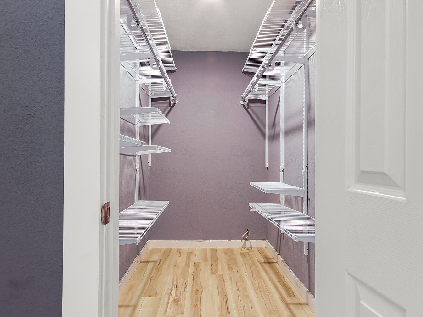 This walk-in closet features a well-organized, spacious layout designed to maximize storage capacity. The walls are painted a muted grayish-purple, creating a calming yet modern atmosphere. On both sides, white wire shelving units are installed, offering multiple levels for hanging clothes and placing folded items. The flooring is a light wood laminate, adding warmth and contrast to the cooler wall tones. A clean, white door frames the entry, and the space is illuminated by a ceiling light, ensuring good visibility for selecting outfits. The closet combines practicality with a subtle touch of contemporary style.