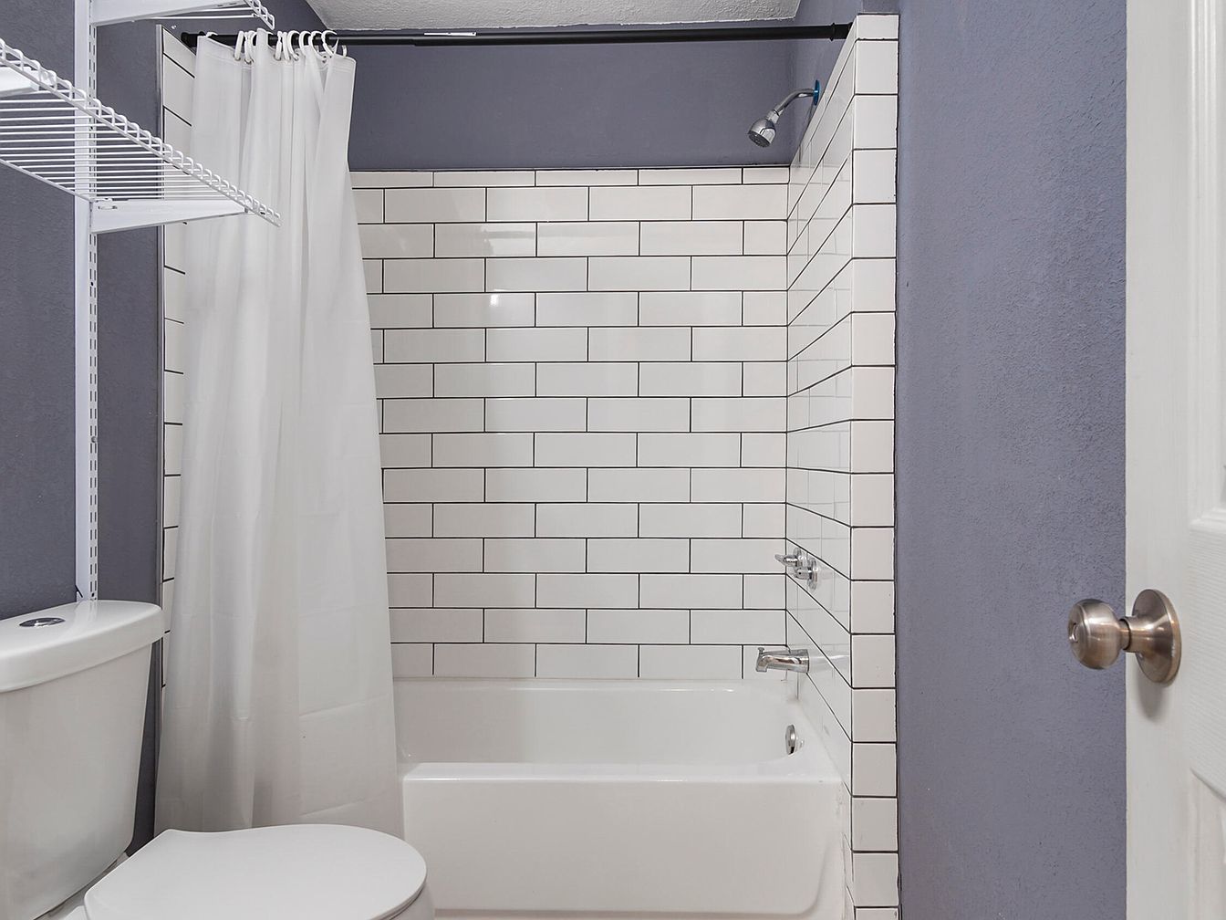 This bathroom features a clean and modern shower area highlighted by large white subway tiles with dark grout, creating a classic yet contemporary look. The combination of the white tiles with the soft lavender-gray walls adds subtle contrast and depth to the space. The bathtub is a simple, white, rectangular design with a chrome faucet and showerhead complementing the overall minimalist aesthetic. A white shower curtain hangs from a curved rod, enhancing the open feel of the room. Adjacent to the tub, a white toilet and wire shelving offer practical storage, maintaining a tidy and uncluttered environment.