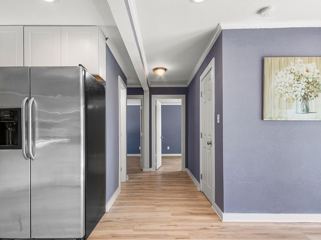 This corridor connects the kitchen area to several rooms, showcasing a smooth transition with light wood laminate flooring that contrasts elegantly with soft purple walls. White trim and door frames add crisp architectural detail, enhancing the bright and clean atmosphere. The hallway ceiling features simple molding and a central light fixture that casts a warm glow. On the left side, a modern stainless steel refrigerator marks the kitchen boundary. The right wall is accented by a tasteful floral painting, adding a subtle decorative touch while maintaining a cohesive, inviting aesthetic throughout the space.