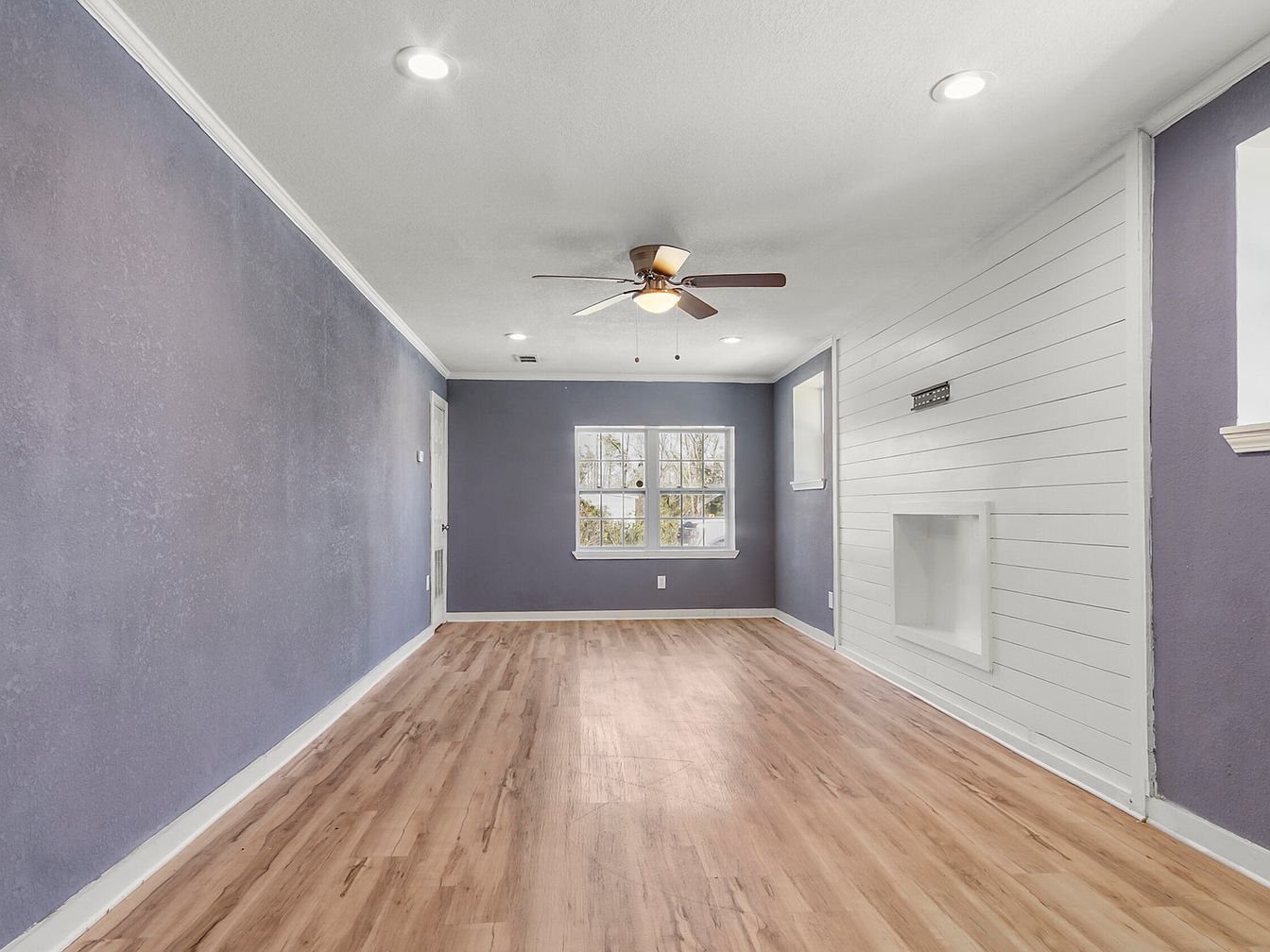 This living room features a contemporary, clean design with a calming color palette primarily composed of soft lavender-gray walls and bright white accents. The floor sports a light wood plank finish, adding warmth and texture to the space. The white shiplap accent wall, which incorporates a built-in nook and a mount for a flat-screen TV, introduces a charming farmhouse element. Natural light pours in through a centrally placed window at the far end, complemented by multiple recessed ceiling lights and a ceiling fan with wood blades, ensuring both brightness and ventilation. The room’s minimalistic aesthetic invites personalization with furnishings and decor.
