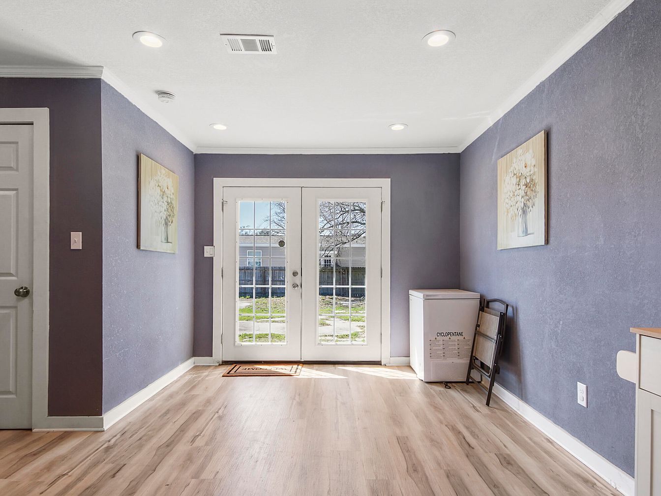 This bright sunroom entrance features double French doors with glass panes that invite ample natural light while providing an inviting connection to the outdoor space. Walls painted in a soft lavender tone contrast warmly with the light wood-look flooring, creating a serene yet modern ambiance. The ceiling boasts recessed lighting and crown molding, adding subtle architectural interest. Two floral artworks hanging opposite each other introduce delicate, calming details. A white storage freezer and a folded chair leaning against the wall suggest practical use of the cozy, uncluttered space, perfect for a versatile entry or sitting area.