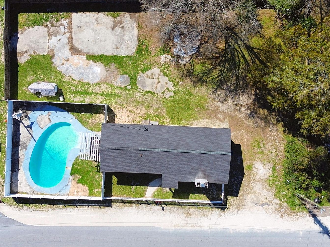 This spacious backyard features a kidney-shaped in-ground swimming pool enclosed by a fence, providing privacy and safety. The pool area is paved with light blue concrete, contrasting with the natural green grass and patches of earth that surround it. Adjacent to the pool is a covered structure with a dark shingled roof extending over a shaded patio space. Concrete slabs and weathered patches of ground create varied textures throughout the yard, blending natural elements with functional outdoor living. Mature trees cast intricate shadows, enriching the tranquil, open-air atmosphere of this outdoor retreat.