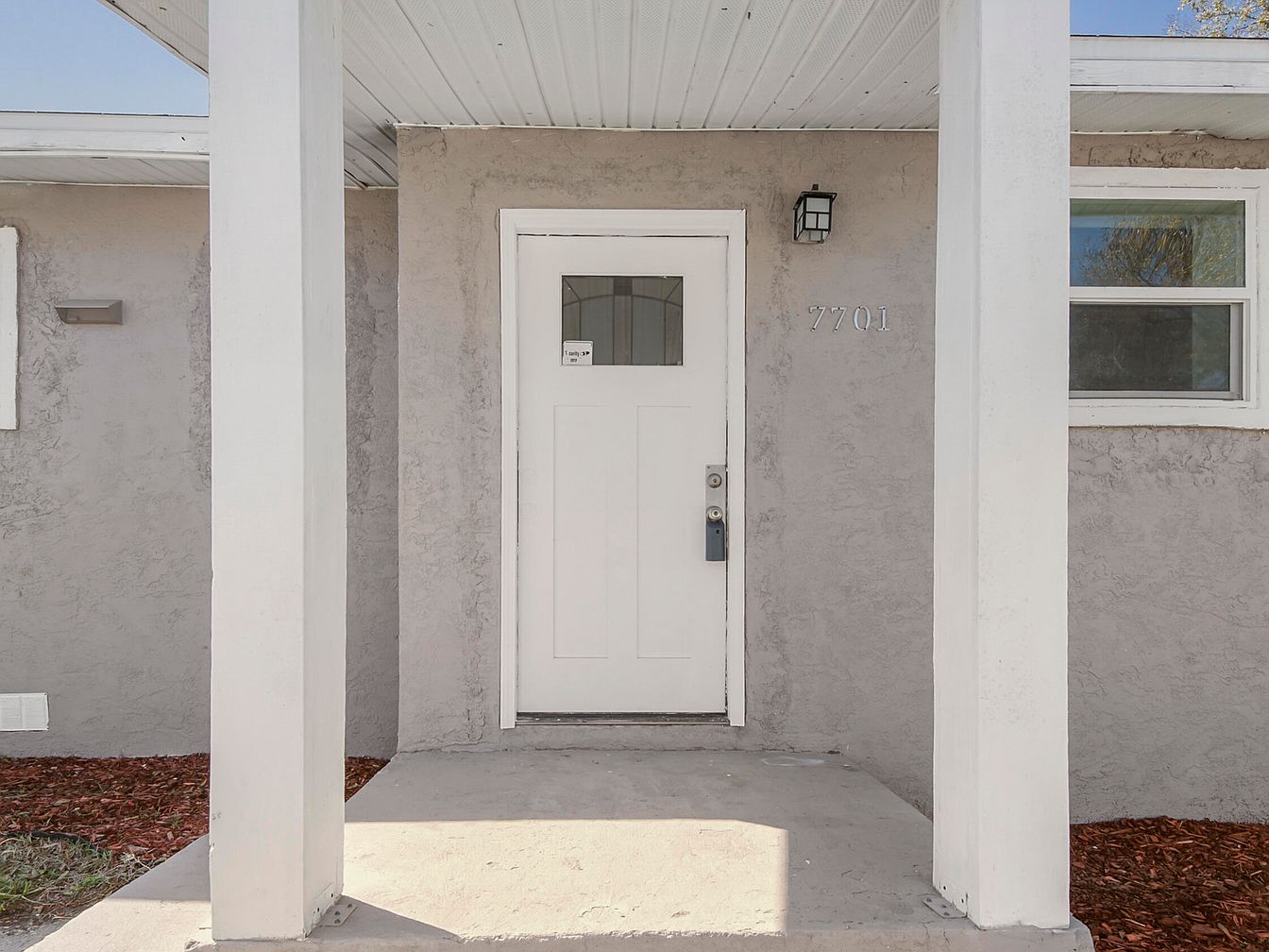 This welcoming front porch features a simple yet clean design with a neutral palette dominated by light grey stucco walls and white trim. A sturdy white front door with a small, rectangular window at the top allows subtle natural light to enter while maintaining privacy. Two white structural columns frame the doorway, adding to the porch’s symmetrical appearance and supporting the overhead roof with white paneling. A black square wall lantern provides lighting, positioned near the house number “7701” displayed in modern silver numerals on the right side of the entrance. The concrete floor is smooth, complemented by mulch landscaping on either side, creating a neat and understated curb appeal.