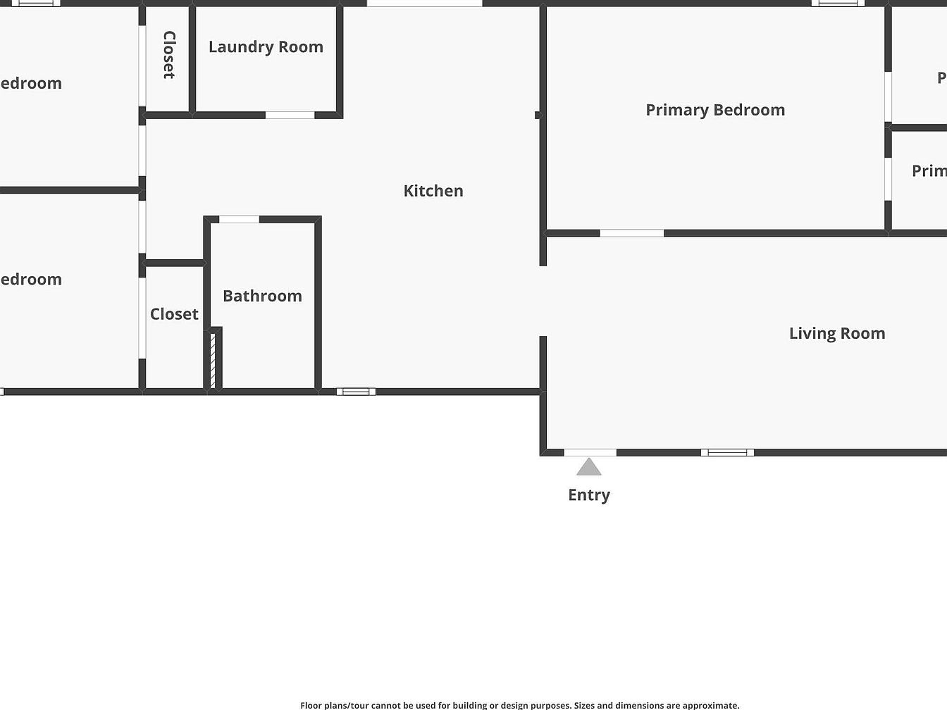 This floor plan highlights a practical home layout with a focus on flow and functionality. Entry leads directly into a spacious living room, adjacent to a generously sized kitchen that connects to a laundry room for convenience. The primary bedroom is situated privately, featuring two connected primary closets. Two additional bedrooms share a centrally located bathroom. The design prioritizes efficient use of space, with closets integrated near bedrooms and laundry adjacent to the kitchen, supporting easy household management. The clean, monochromatic palette of the floor plan allows clear visualization of room relationships and boundaries.