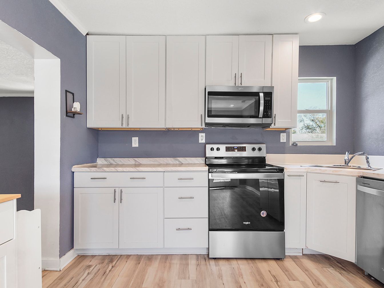 This kitchen workspace features a clean and modern design with white cabinetry and light marble-like countertops creating a fresh, airy feel. The cabinetry extends above and below the counter, providing ample storage. Stainless steel appliances, including a sleek microwave and stove, add a contemporary touch. The walls are painted in a muted blue-grey tone, complementing the crisp white cabinets and adding subtle color contrast. Light wood flooring adds warmth and texture. A small window near the sink brings natural light, enhancing the bright, welcoming atmosphere of this functional kitchen corner.