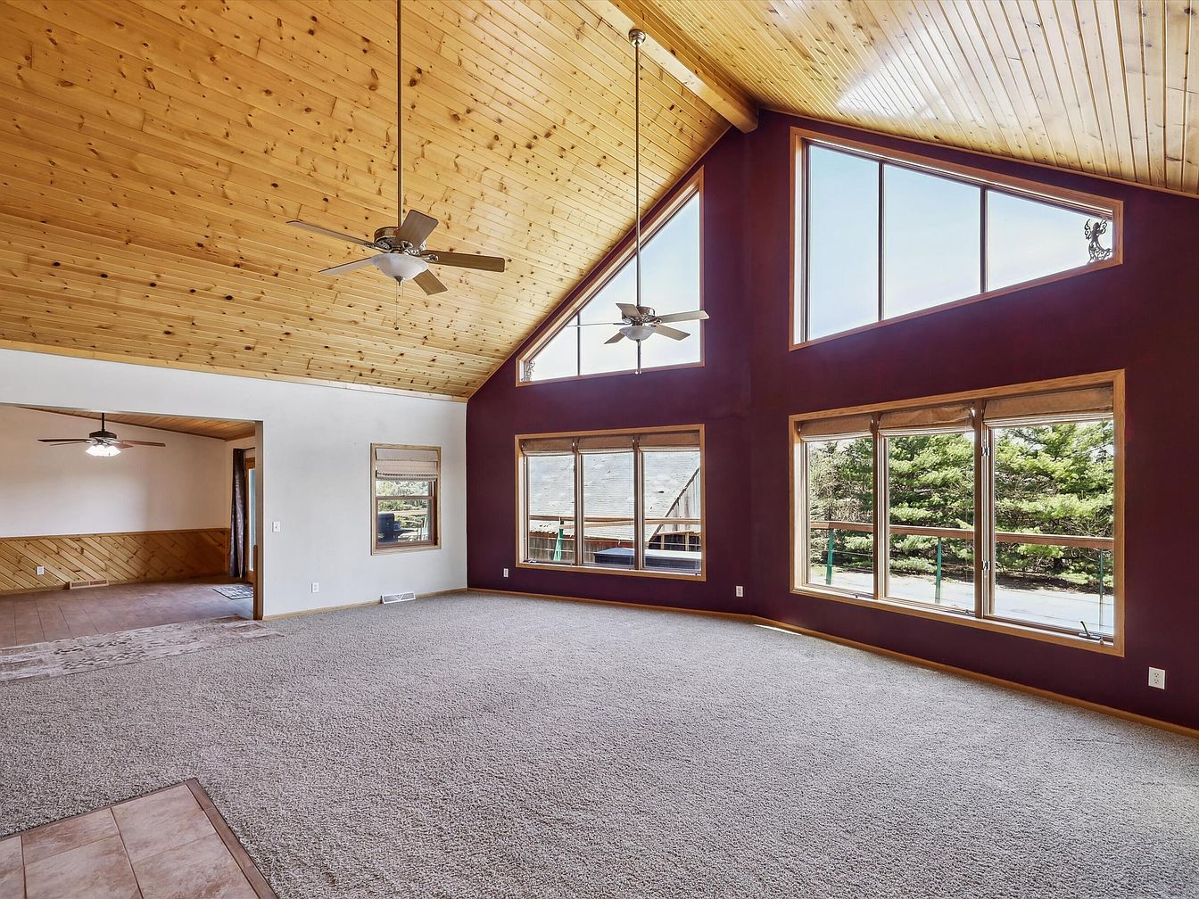 This spacious living room features an impressive vaulted ceiling clad in natural wood planks, complemented by two ceiling fans to enhance air circulation. The walls are painted a deep, rich purple, creating a bold contrast with the warm wood trim around the expansive windows. These windows vary in shape, including large rectangular panes topped with angular triangular ones, allowing abundant natural light to flood the space and offering beautiful outdoor views. The floor is covered in a soft, neutral-toned carpet that adds coziness. Adjacent is an open doorway leading to another room with wood-paneled lower walls and more ceiling fans, suggesting a harmonious flow throughout the home.