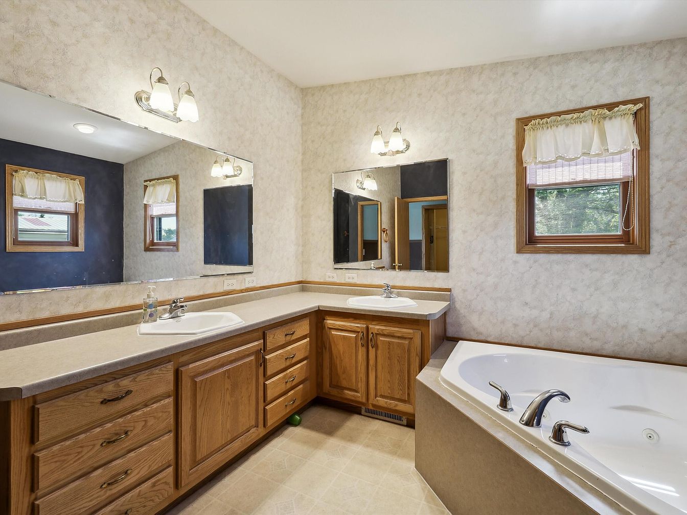 This bathroom presents a spacious corner vanity with two sinks set in a long, smooth countertop held by wooden cabinetry that combines drawers and cupboards. The cabinetry’s warm oak tone contrasts softly against the neutral beige walls, which are subtly textured with a cloud-like pattern. Above each sink, square mirrors are paired with chrome-finished light fixtures featuring soft, frosted glass shades for gentle illumination. Adjacent to the vanity is a large built-in soaking tub with polished silver faucets. Natural light filters in through a modest window trimmed in matching wood, dressed with a delicate white fanned valance, adding a touch of charm and homeliness.