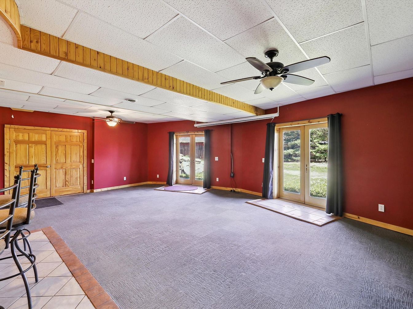 This spacious basement recreation room features deep red walls contrasted with natural wood trim and doors, creating a warm yet vibrant atmosphere. Two large glass double doors framed in wood allow ample natural light to flow in, opening to the outdoors and visually extending the space. The ceiling is composed of white acoustic tiles interrupted by a rustic wood beam, while two ceiling fans with light fixtures provide air circulation and illumination. The floor is carpeted in a muted gray grid pattern, complemented by a small tiled section near the bar stools, which hints at an adjacent kitchen or bar area. Overall, the room blends cozy elements with functional design, ideal for gatherings or relaxation.