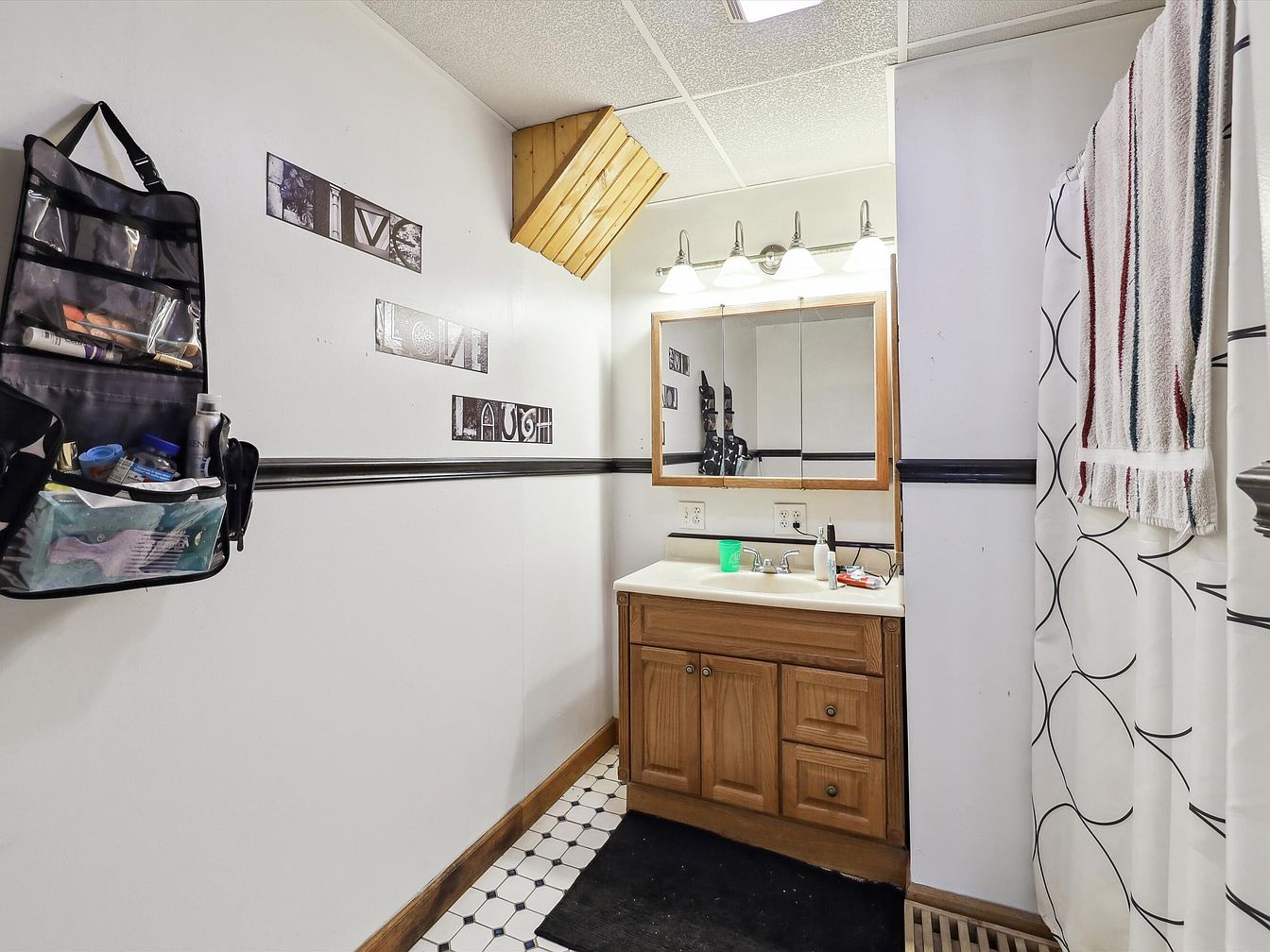 This compact bathroom features a warm wooden vanity with classic paneled doors and drawers beneath a cream-colored countertop. Above, a large mirror with a wooden frame is illuminated by a four-light fixture, contributing to the room’s bright ambiance. The floor features a white tile pattern with small dark accents, bordered by natural wood trim that matches the vanity. A black horizontal trim runs along the middle of the white walls, adding a subtle contrast. On the right, a shower is enclosed with a curtain displaying a minimalistic black circular pattern. Practical storage hangs on the left wall, while small decorative word art enhances the simple yet functional aesthetic.