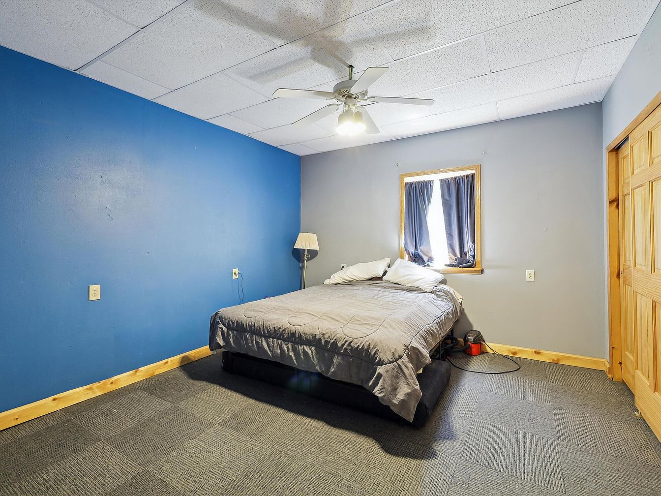 This compact bedroom features a striking dual-tone wall scheme with a bold blue accent wall contrasting against a soft gray, complemented by natural wood trim around the window, baseboards, and closet doors. A centered bed with neutral gray bedding is positioned under a white ceiling fan with integrated lighting, offering comfort and practicality. The room’s ceiling is composed of white acoustic tiles, contributing to sound absorption. Gray carpet squares cover the floor, adding texture and warmth. A small window with dark curtains filters natural light, creating a calm, restful atmosphere in this modest yet functional space.