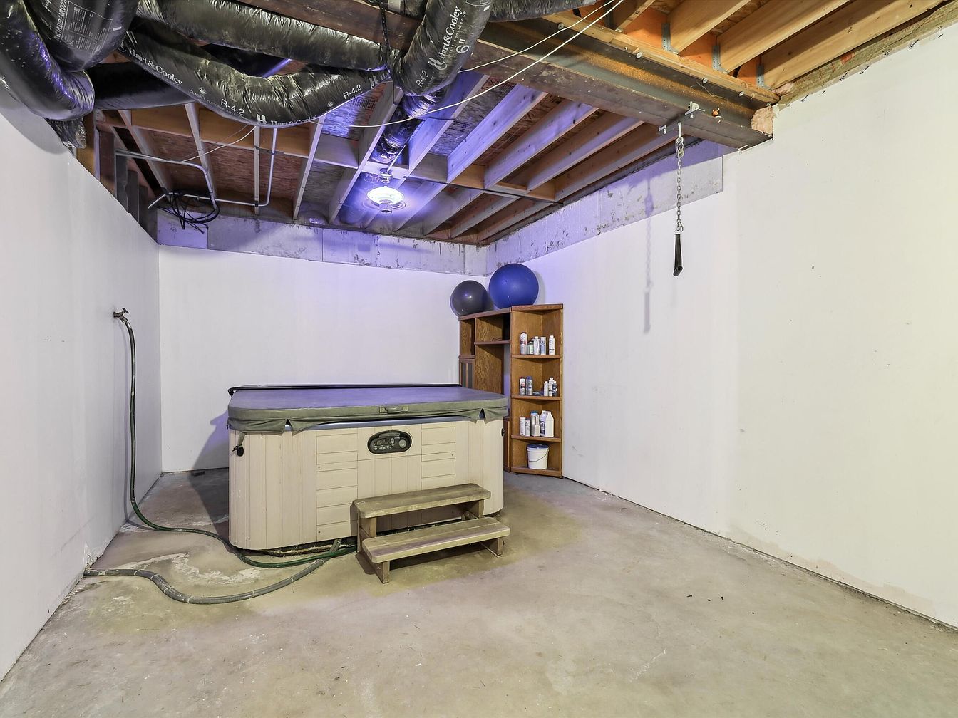 This unfinished basement space is utilized as a casual recreation area, highlighted by a covered hot tub positioned in a corner with a small set of wooden steps for access. The room features exposed ceiling joists and ductwork with black insulation wrapping, contributing to an industrial feel. The walls are painted white, lending brightness to the otherwise raw concrete floor. A wooden shelving unit holds various bottles and two fitness balls, indicating a functional, multi-purpose use for relaxation and wellness. A pull chain hanging from the ceiling suggests lighting control. The space is simple but practical, prioritizing utility and comfort.