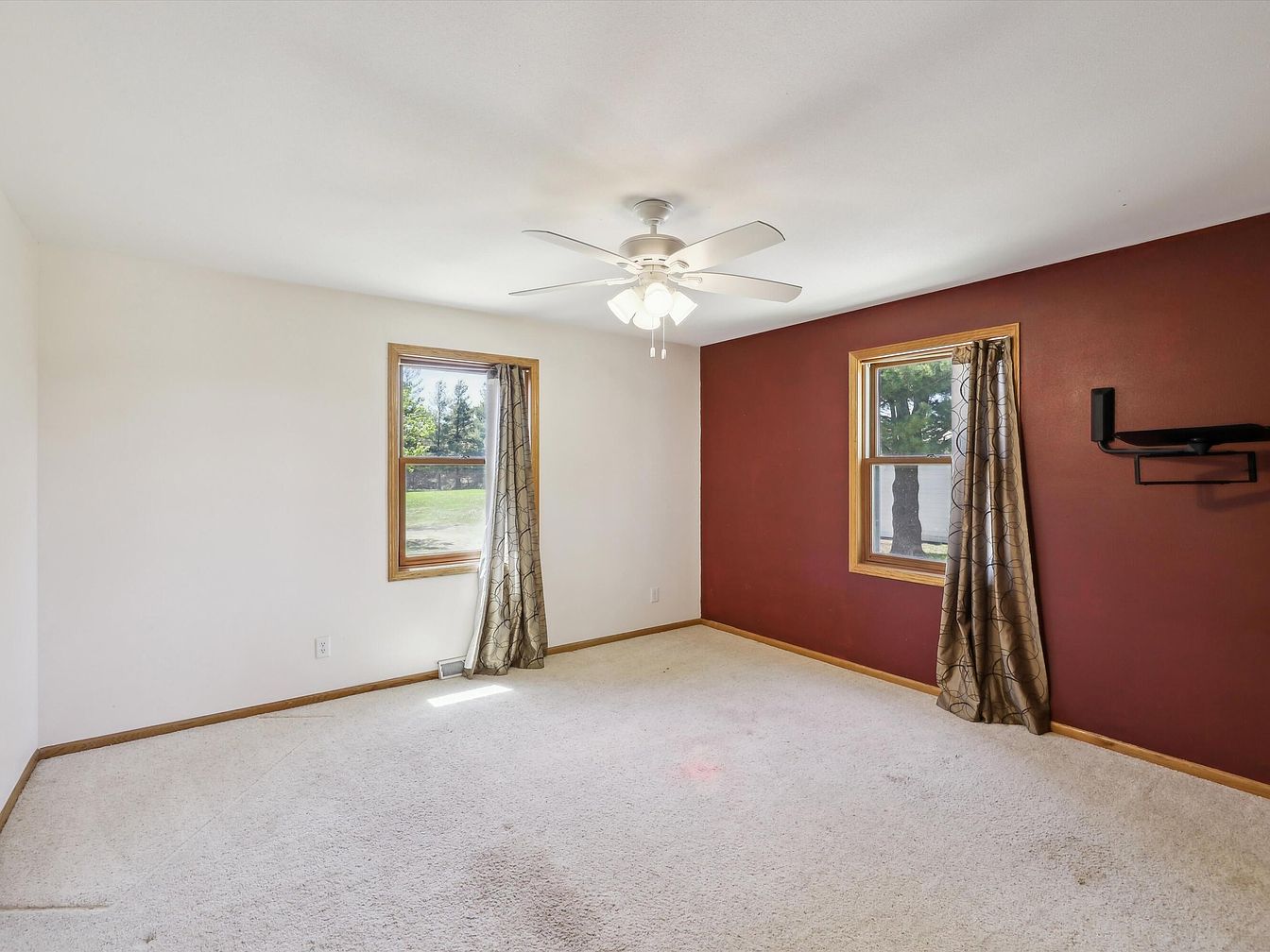 This bedroom features a clean, minimalist layout with light beige carpeting complementing the white walls and creating a spacious feel. One wall painted in a deep burgundy adds a rich, warm touch and anchors the room, framed by natural wood trim around two medium-sized windows. Each window is dressed with metallic silver-grey curtains that have a subtle circular pattern, providing a soft contrast to the bold wall. A white ceiling fan with a light fixture hangs centrally, blending functionality with simple style. The mounted black TV bracket suggests modern convenience integrated into this cozy yet understated retreat.