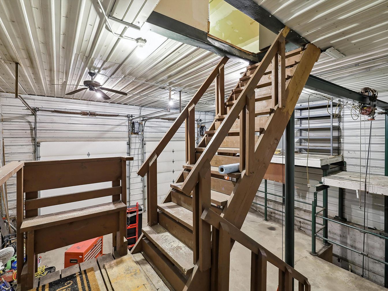 This space is a utilitarian garage featuring a prominent wooden staircase with sturdy railings leading to an upper level or loft. The garage walls and ceiling are clad in white corrugated metal panels, enhancing the industrial feel, while a ceiling fan and overhead light fixture provide ventilation and illumination. Metal shelving units line the garage walls, offering ample storage for tools or supplies. The concrete floor emphasizes functionality, with various work and storage areas arranged throughout. The brown wooden stairs add a warm contrast to the otherwise metallic and neutral-toned setting.