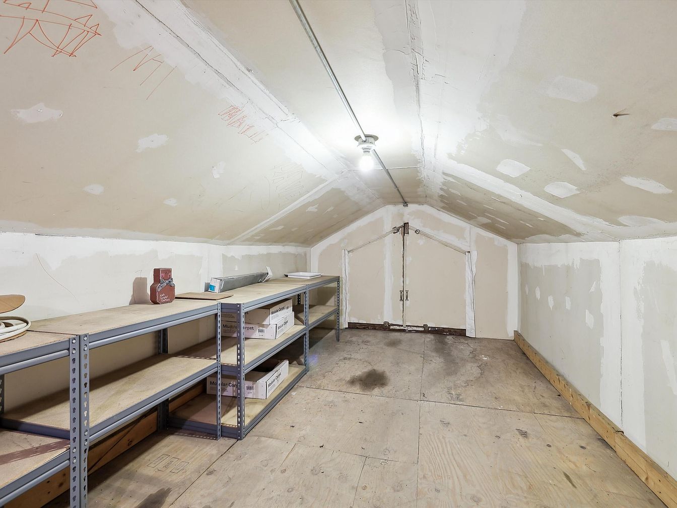 This attic storage area is characterized by its sloped, unfinished drywall ceiling and walls with visible patchwork and drywall tape seams. The floor consists of bare plywood with some discoloration and minor stains, adding to the raw, utilitarian atmosphere. Metal shelving units run along one side, providing ample storage space for boxes and miscellaneous items. A single bare bulb fixture with exposed conduit illuminates the space, while a distinctive small door with metal hinges anchors the far end. This space is functional, slightly rustic, and ideal for organized storage rather than living.
