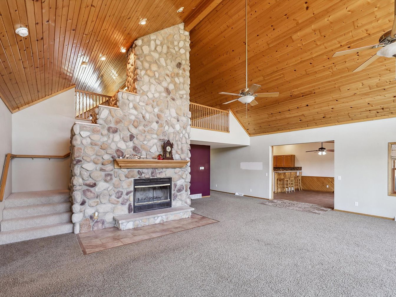 A spacious living room features a stunning floor-to-ceiling stone fireplace as its centerpiece, adding rustic charm. The textured stone contrasts softly with the neutral-toned carpeting that covers the floor. A warm wood-paneled vaulted ceiling enhances the open, airy ambiance and draws the eye upward. Two ceiling fans with lights provide both airflow and illumination to the room. A cozy stairway on the left leads to a loft with a wood railing, while an adjacent open doorway connects to the kitchen and dining area. The walls are painted in a light neutral with one accent wall in deep plum, complementing the home’s earthy, natural palette.