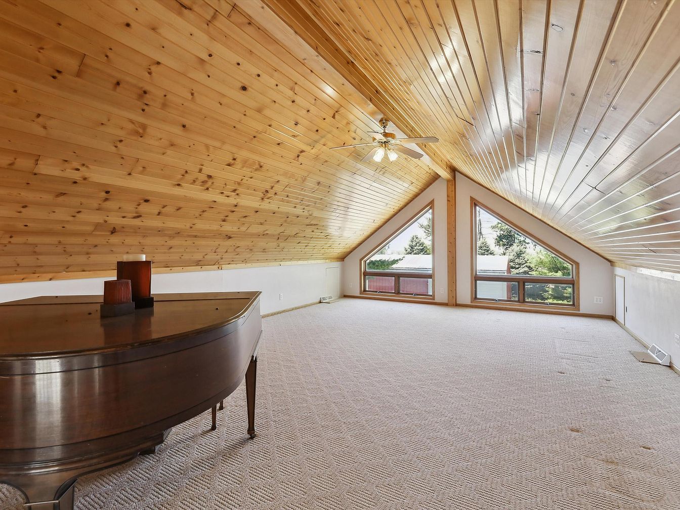 This spacious attic room is defined by its angled wooden plank ceiling, adding warm, rustic charm to the space. Large triangular windows at the far end offer abundant natural light and views of greenery outside, visually expanding the room while maintaining cozy comfort. The light beige carpet with subtle patterns softens the floor, enhancing the inviting atmosphere. A dark wood grand piano positioned to the left introduces elegance and suggests this area as a serene music or relaxation retreat. The neutral walls and ceiling fan illuminate the space, combining functionality with aesthetic appeal.