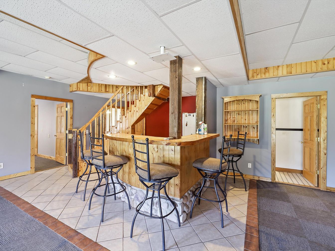 This cozy basement bar features a warm mix of natural wood tones and rustic elements. The centerpiece is a wooden bar with a sturdy countertop supported by stone accents, surrounded by four iron bar stools with cushioned seats. Behind the bar, a staircase with matching wood finishes ascends, creating a unified look. The room’s walls are painted a muted gray, complementing the natural wood trim around the doors and built-in shelving. The tiled floor contrasts with carpeted areas, and the dropped ceiling with recessed lighting adds functional brightness to this inviting social space.