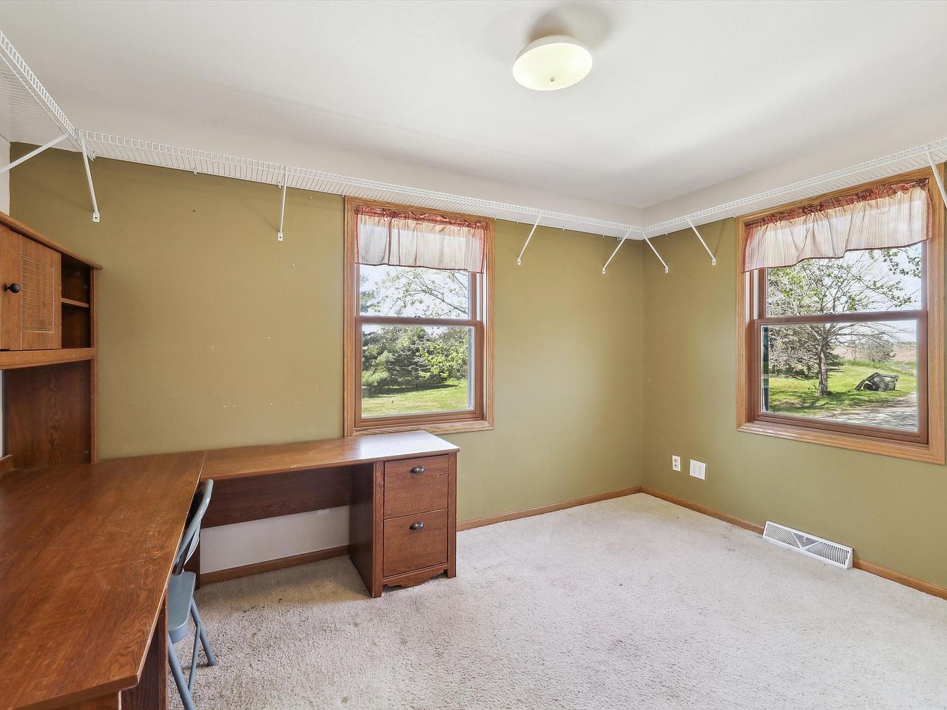 This cozy home office nook is painted in a warm olive green, contrasted by natural wood trim around two bright windows that bring in abundant daylight and views of lush greenery. The L-shaped wooden desk with an integrated hutch provides ample workspace and storage, complemented by a simple metal chair. White wire shelving wraps around the upper walls, ideal for organizing supplies or decor. The neutral, slightly worn carpet and simple ceiling light fixture give this room a functional, inviting feel, perfect for focused work or study within a quiet corner of the house.
