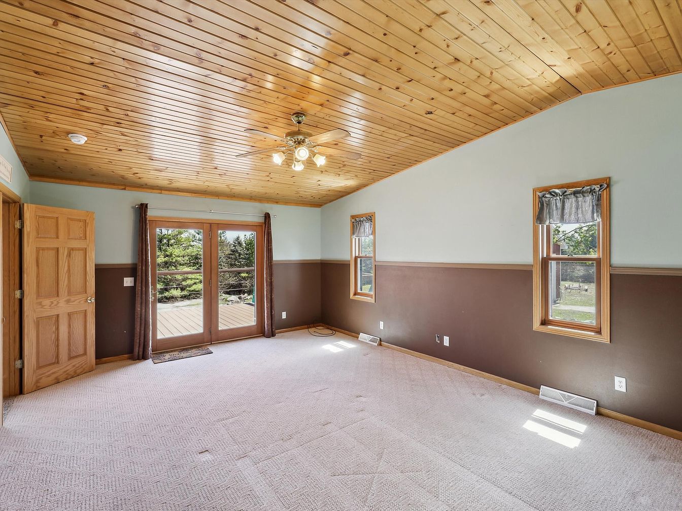 This spacious bedroom features a warm wood-paneled ceiling that adds a rustic charm, complemented by soft blue walls above a rich brown wainscoting that encircles the room. Plush beige carpeting covers the floor, providing a cozy underfoot feel. Two tall windows dressed with gray valances allow natural light to brighten the space. A set of wooden French doors with glass panes opens directly to an outdoor deck, blending indoor and outdoor living. The room’s layout is simple yet inviting, primed for personalized furnishing and cozy relaxation.