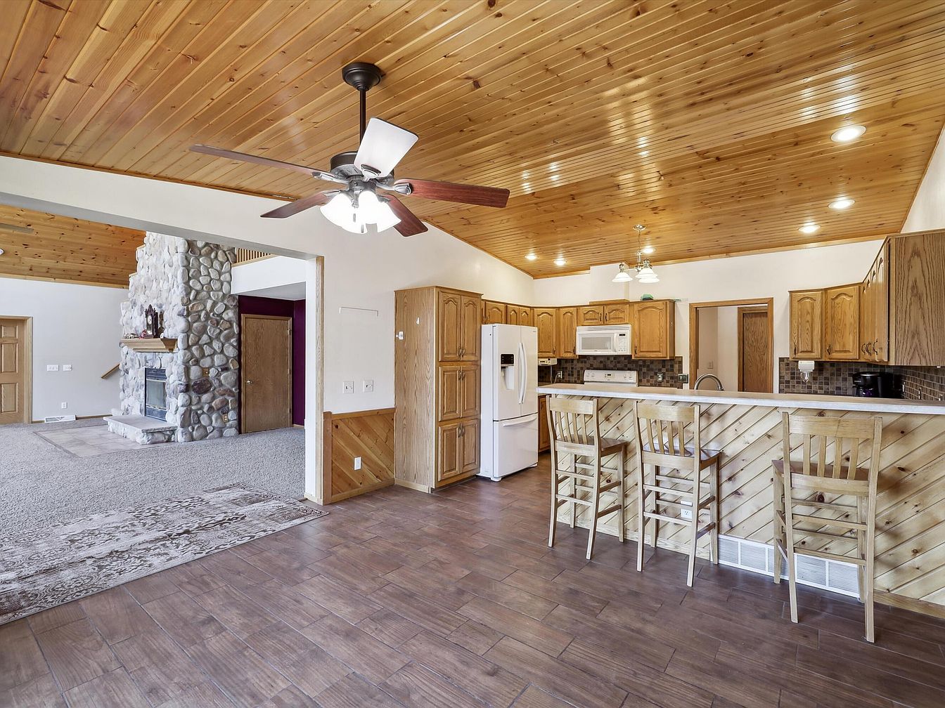 This open-plan space combines a kitchen and living area, characterized by a warm, rustic aesthetic. The wood-paneled ceiling with recessed lighting and a ceiling fan creates an inviting ambiance, complemented by natural wood cabinets and a white refrigerator and microwave. The kitchen island features a decorative wood panel front with three wooden bar stools, ample counter space, and a mosaic tile backsplash enhancing texture and contrast. The adjacent living room area includes a large stone fireplace as a focal point, inviting relaxation on the carpeted flooring next to the polished wood tile in the kitchen, blending comfort with functionality.