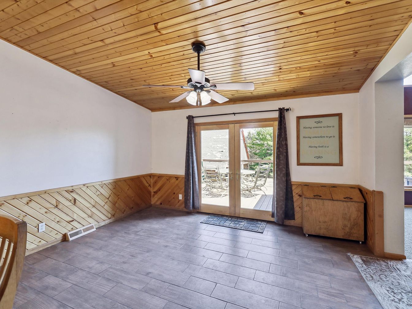 This dining space features natural wood paneling that adorns the lower walls and extends across the ceiling, creating a warm and rustic atmosphere. The light wood tones contrast softly with the off-white upper walls, offering a cozy yet open feel. Wide, rectangular tiles with a muted gray finish cover the floor, adding a modern touch that balances the natural elements. A ceiling fan with five blades and integrated lighting hangs centrally, offering both comfort and style. French doors framed in matching wood open to an outdoor seating area, inviting natural light and seamless indoor-outdoor flow. Subtle decor includes dark curtains and a small wooden cabinet tucked in the corner beneath an inspiring wall sign.