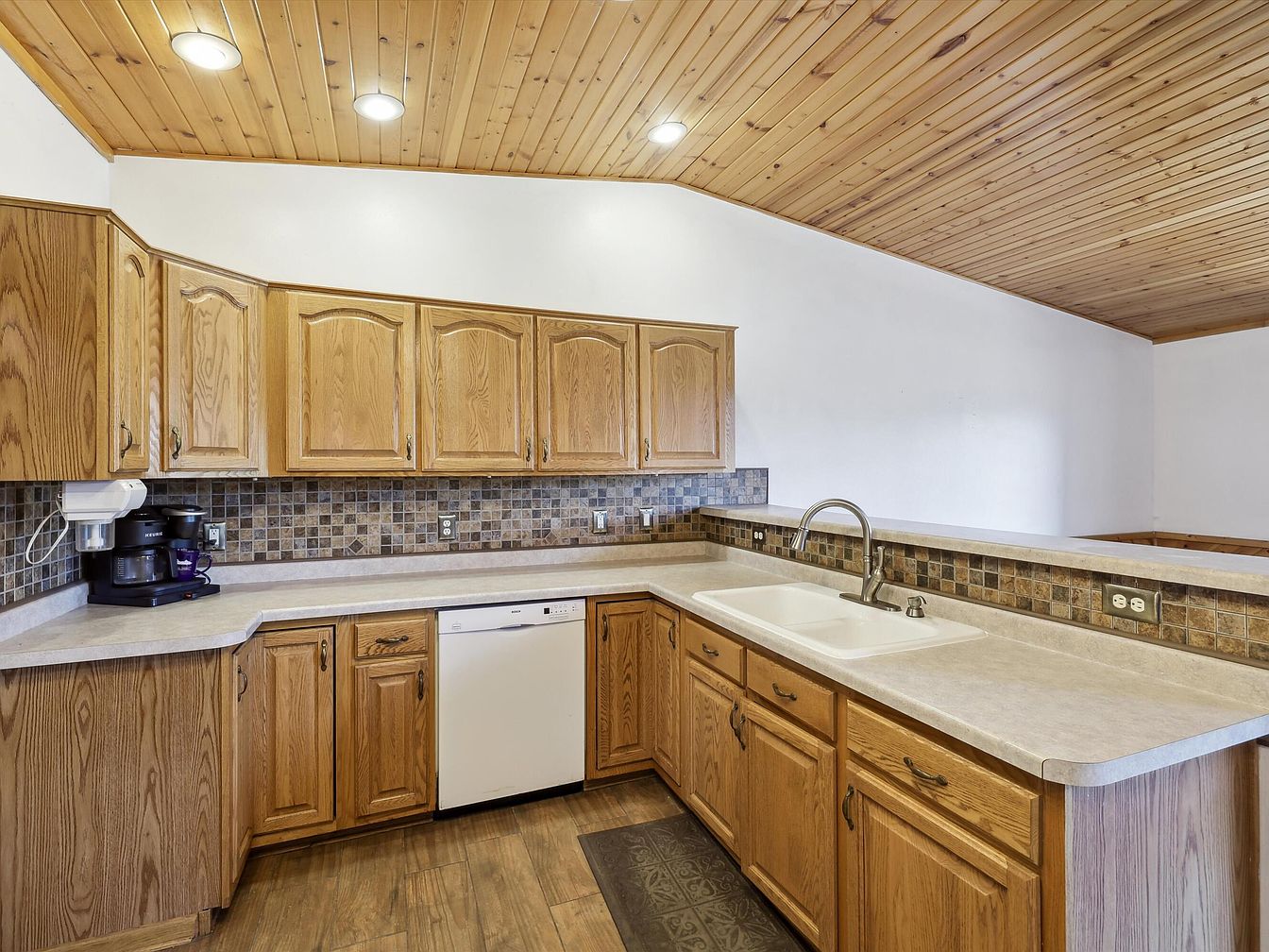 This kitchen features a practical U-shaped layout with ample countertop space in a light beige hue. Oak cabinetry with classic raised panel doors lines the walls, providing abundant storage and a warm, natural wood tone that complements the wood-paneled ceiling. The backsplash is adorned with a mosaic of earth-toned tiles, adding texture and visual interest while coordinating with the cabinetry and flooring. A white double basin sink with a modern faucet sits beneath a half wall, enhancing openness to adjacent spaces. Recessed lighting in the ceiling ensures the area is brightly illuminated, enhancing the cozy yet functional atmosphere.