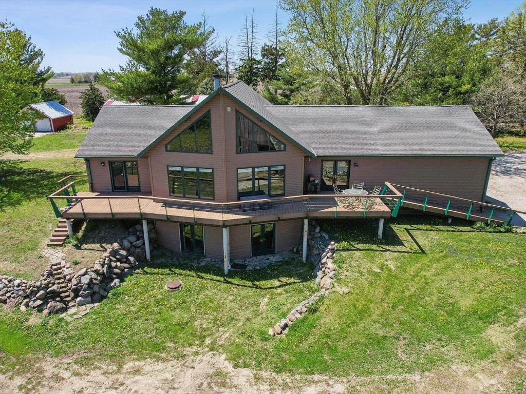 This charming home, located in Story City, Iowa, offers a blend of rustic and modern country architectural style characterized by vaulted knotty pine ceilings and large windows that flood the space with natural light. Built with solid, classic construction, it provides nearly 5 acres of serene open land, featuring mature trees that create a natural windbreak for enhanced privacy. The listing price for this expansive property is $849,900. The house boasts an inviting great room with a two-story wood-burning fireplace, perfect for cozy gatherings. An upstairs loft overlooks the great room, ideal as a reading nook, music room, or play area, adding versatile living space. The eat-in kitchen is fully equipped with a breakfast bar, pantry cabinet, and double doors that open to a composite deck, perfect for enjoying both sunrise coffee and sunset relaxation. The main level includes a private primary suite featuring deck access, vaulted ceiling, a jet tub, and a walk-in closet, alongside an additional bedroom, full bath, and an office. The walkout lower level is designed for entertainment with amenities like a wet bar, projector screen, two bedrooms, a ¾ bath, and an indoor hot tub. The property is well-appointed with energy-efficient geothermal heating and cooling, a radon mitigation system, and plumbing ready for heated floors. Outdoor facilities include a 725 square foot attached garage complete with an overhead gantry, attic access, and a ramp to the lower level. Additional structures enhancing the property’s utility and charm include a detached two-car garage, a 1900s barn, a 24×42 utility shed with power and a large overhead door suitable for workshops or recreational storage, a 42×70 steel building, and a 29×32 crib. This extensive range of outbuildings makes the property exceptionally appealing for hobbyists or those requiring ample storage and workspace. Offering not just a home but a lifestyle, this property perfectly balances wide-open country living with practical modern amenities and infrastructure, providing endless potential and charm in one of Iowa’s inviting rural communities.