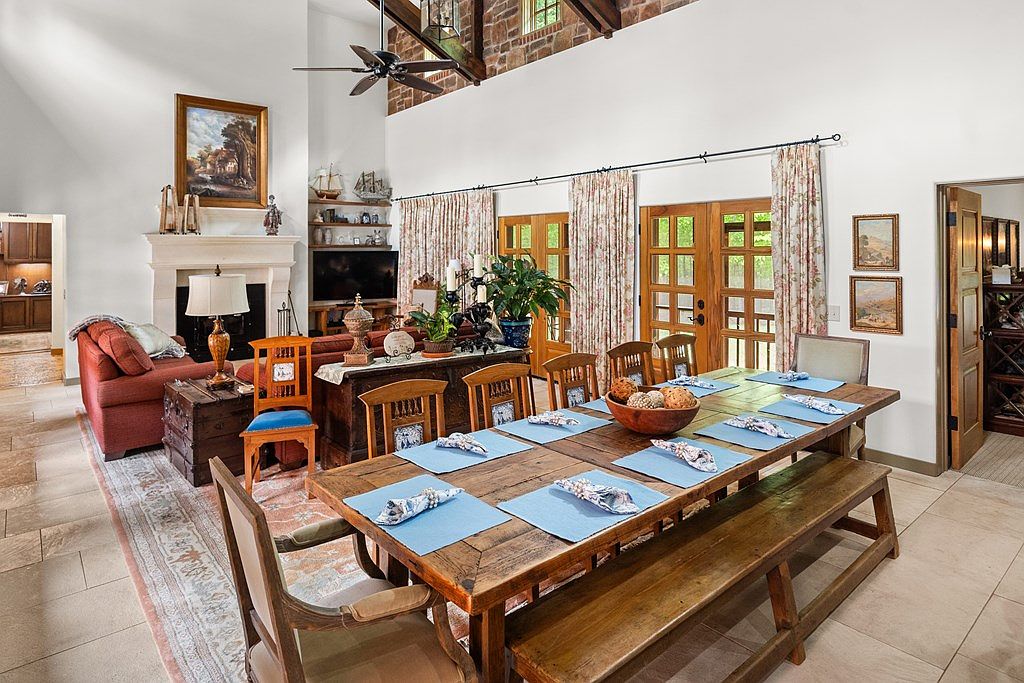 This open-concept dining and living area combines rustic charm with cozy comfort. A large wooden dining table with a matching bench and individual chairs is set with light blue placemats and floral napkins, highlighting the natural wood tones. The living room features a warm, red sofa positioned near a classic stone fireplace, flanked by shelves filled with decorative items. Tall French doors framed by floral curtains allow natural light to flood the space, while exposed ceiling beams and a ceiling fan add architectural interest. The pale tile floor and neutral walls provide a balanced backdrop for this inviting gathering space.