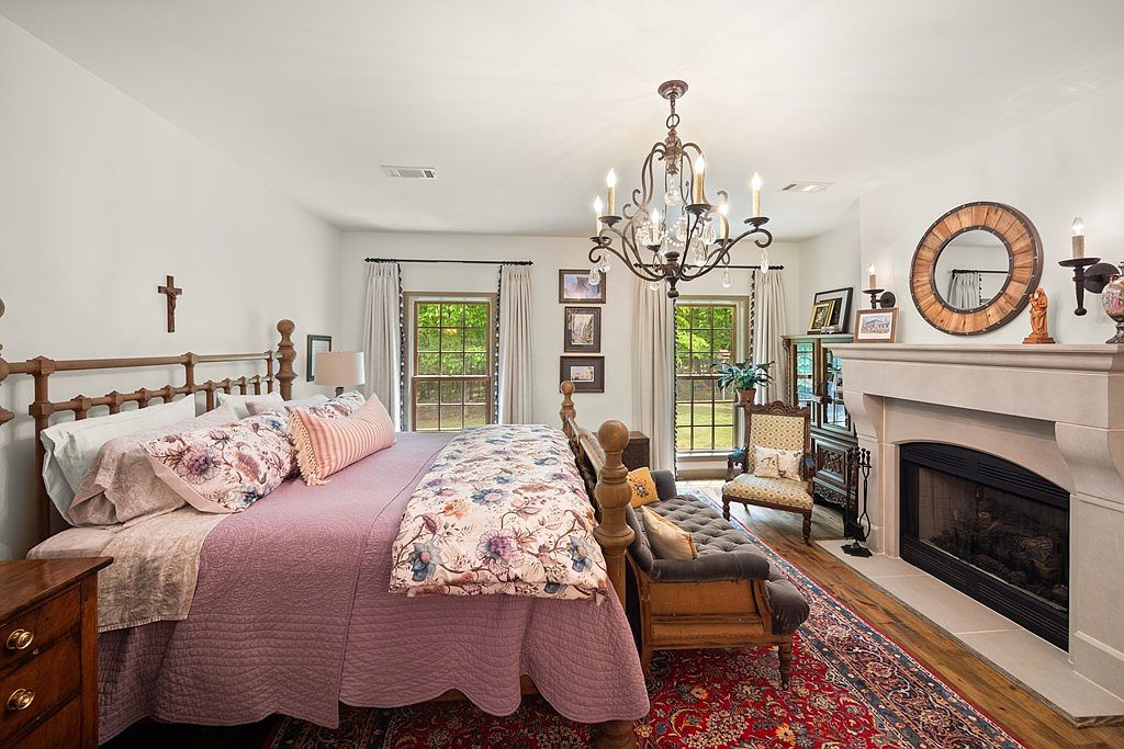 This bedroom features a warm and inviting layout with a large wooden bed dressed in layers of soft purple and floral bedding. The walls are painted a crisp white, enhancing natural light streaming through two sizable windows dressed with neutral curtains. A classic chandelier hangs overhead, adding elegance and charm. The room incorporates a cozy seating area at the foot of the bed with a tufted bench and an upholstered armchair. A substantial stone fireplace with a round wooden-framed mirror above dominates one wall, complemented by traditional wooden furniture and a richly patterned area rug. The overall aesthetic balances classic comfort and refined detail, creating a serene retreat.