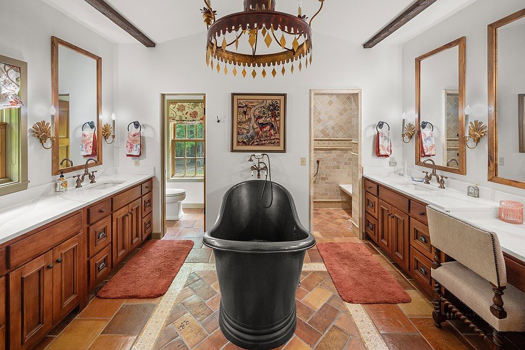 This master bathroom blends classic and rustic elements with a sophisticated layout. A black freestanding tub sits centrally on a warm, earth-toned terracotta tile floor, framed by two symmetrical vanities with rich wood cabinetry topped with white countertops. Each vanity features a tall, framed mirror accented by ornamental sconces with gold leaf details. The walls are painted in a soft, neutral tone, enhancing natural light from the window seen near the toilet area. On the far right, a tiled walk-in shower adds texture and warmth. The space exudes both elegance and comfort, ideal for relaxation.